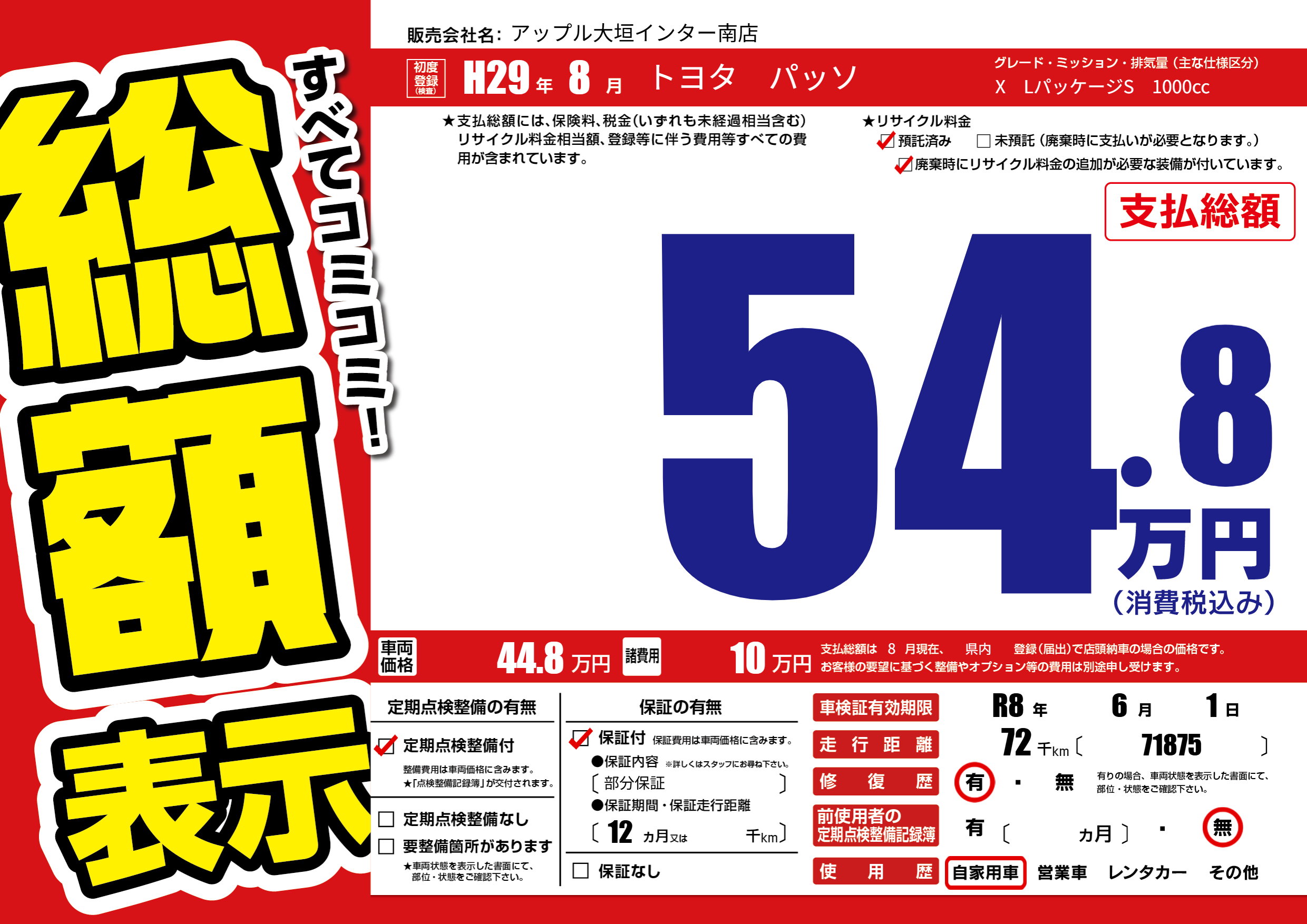 | 車名 | トヨタ パッソ | グレード ミッション 排気量 |