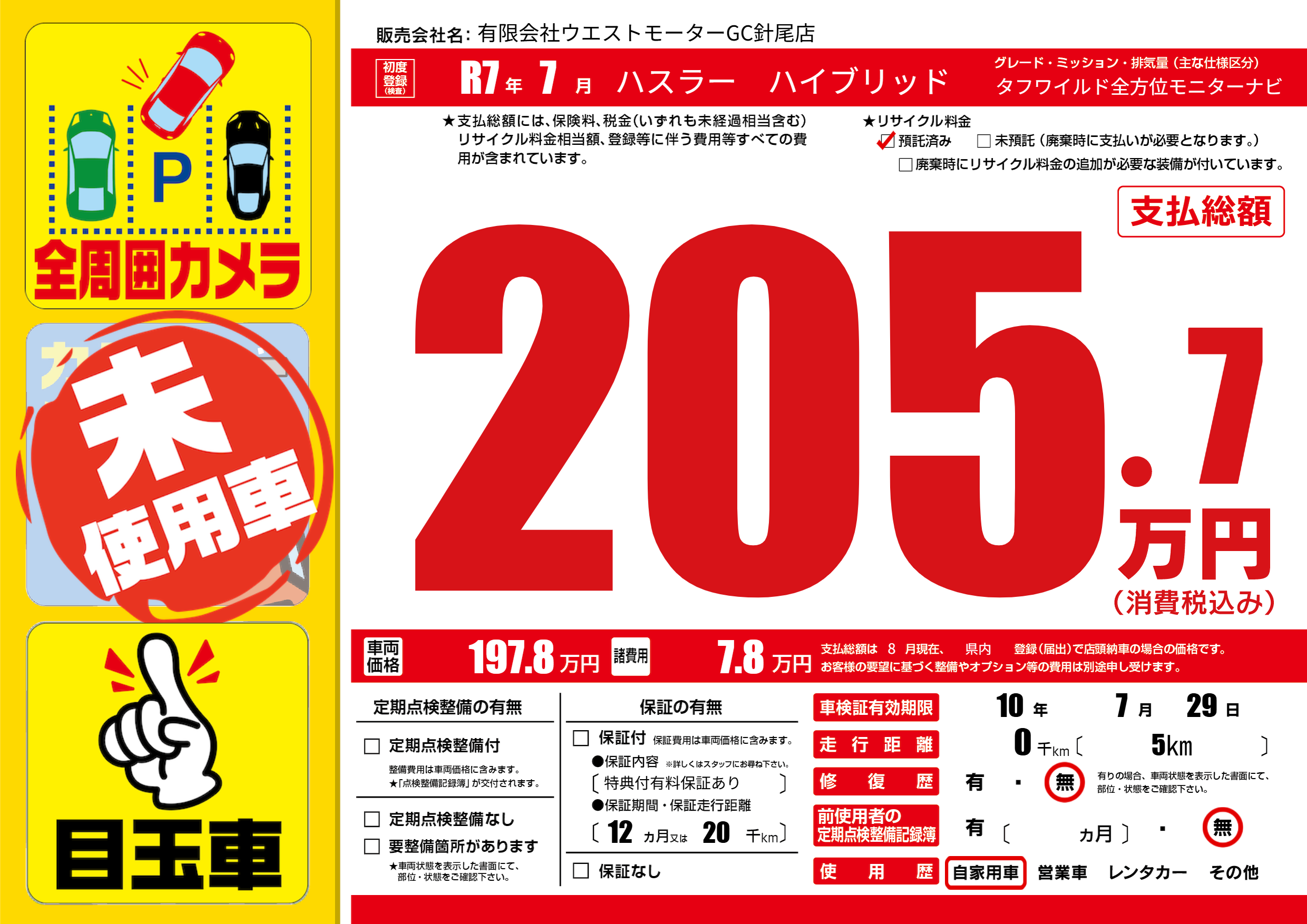 | 走行キロ | - | 初年度登録 | R7年7月 |