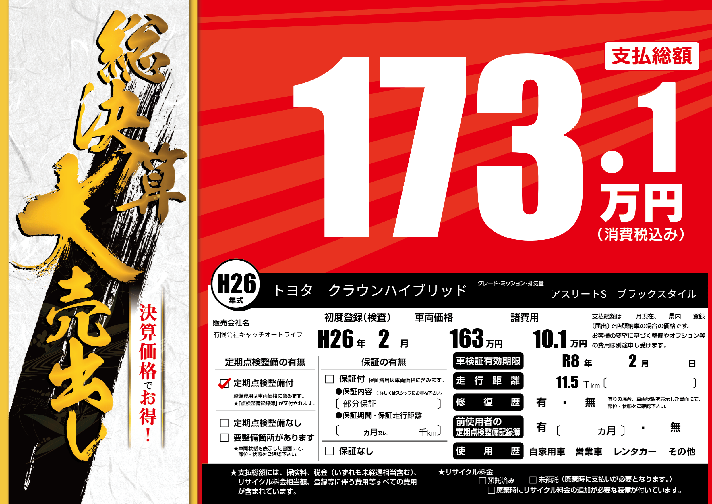 | 車名 | トヨタ クラウンハイブリッド | グレード ミッション 排気量 |