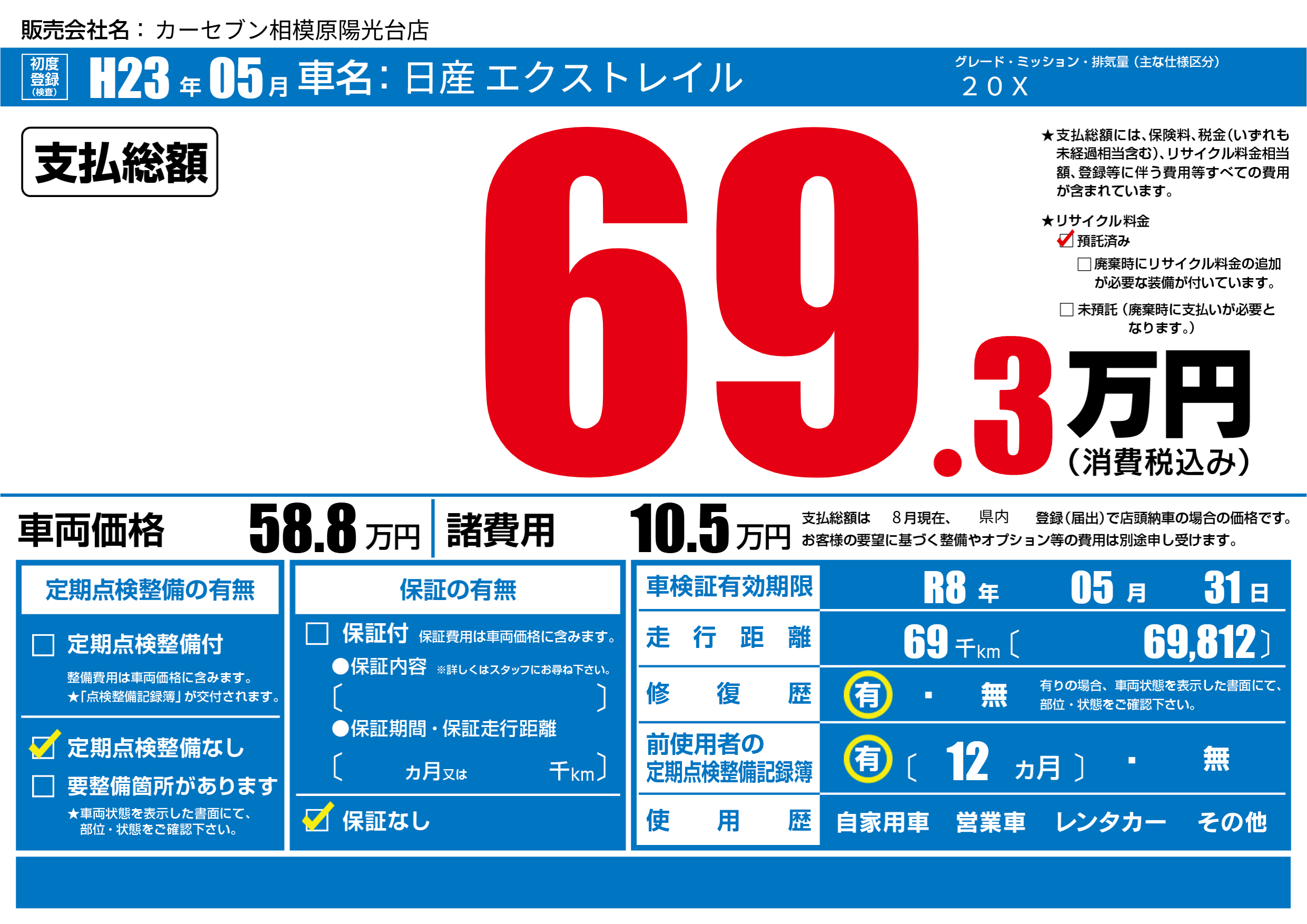 | 走行キロ | 6.9万km | 初年度登録 | H23年05月 |