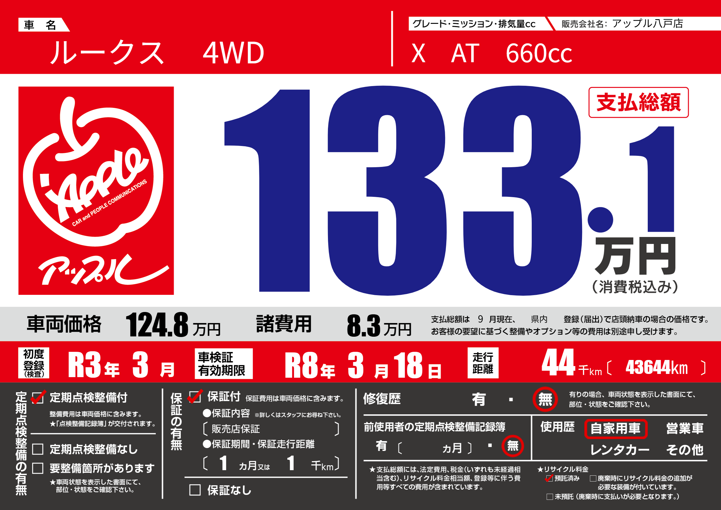 | 走行キロ | 4.4万km | 初年度登録 | R3年3月 |