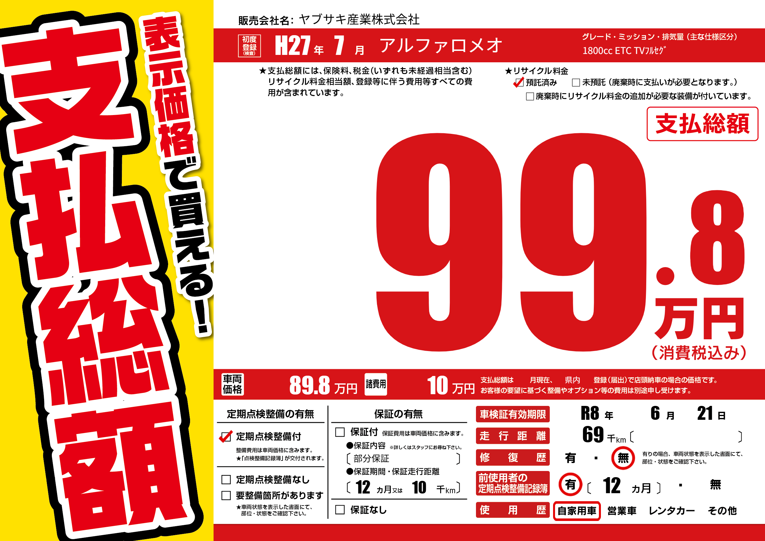 | 走行キロ | 6.9万km | 初年度登録 | H27年7月 |