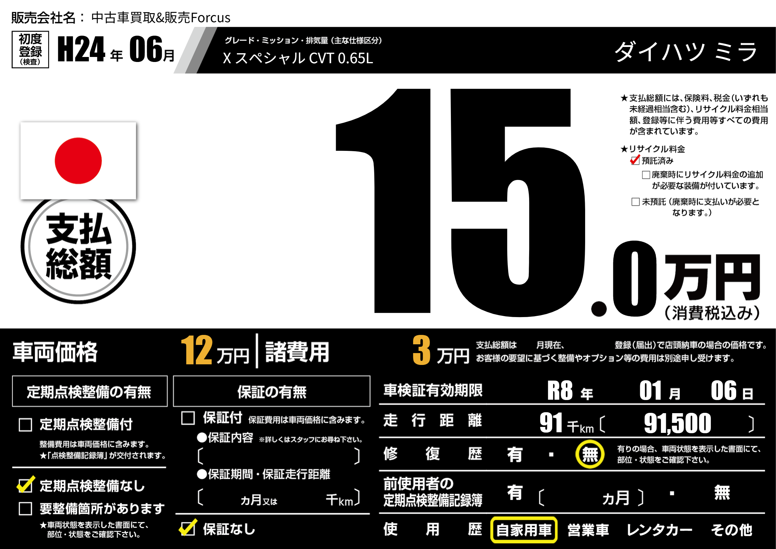 | 走行キロ | 9.1万km | 初年度登録 | H24年06月 |