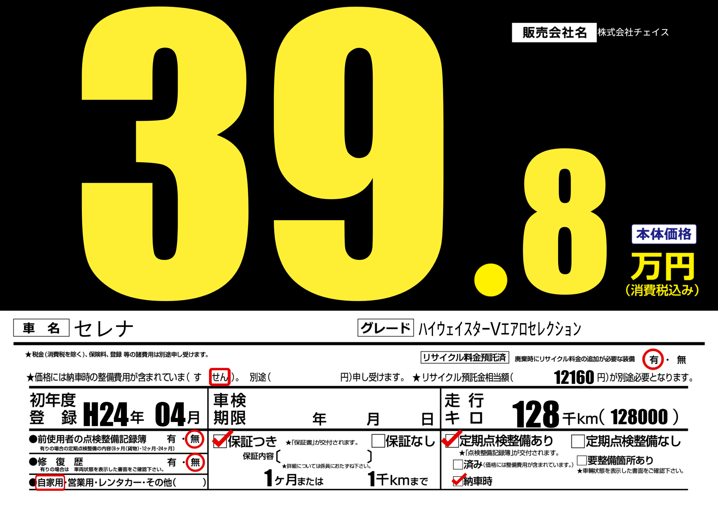 | 走行キロ | 12.8万km | 初年度登録 | H24年04月 |