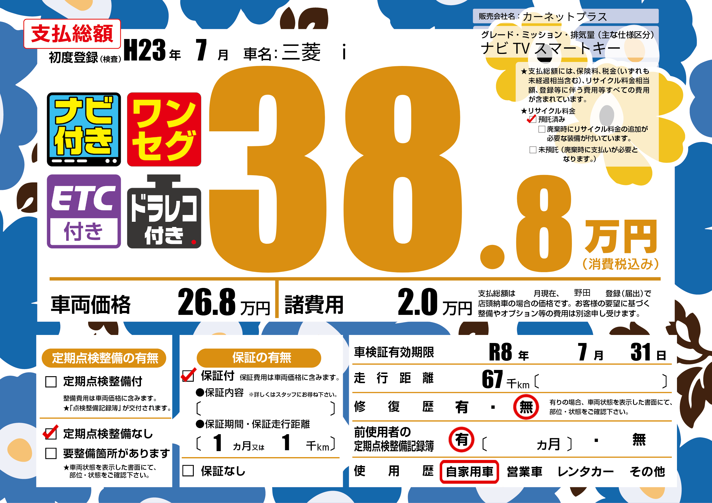 | 走行キロ | 6.7万km | 初年度登録 | H23年7月 |
