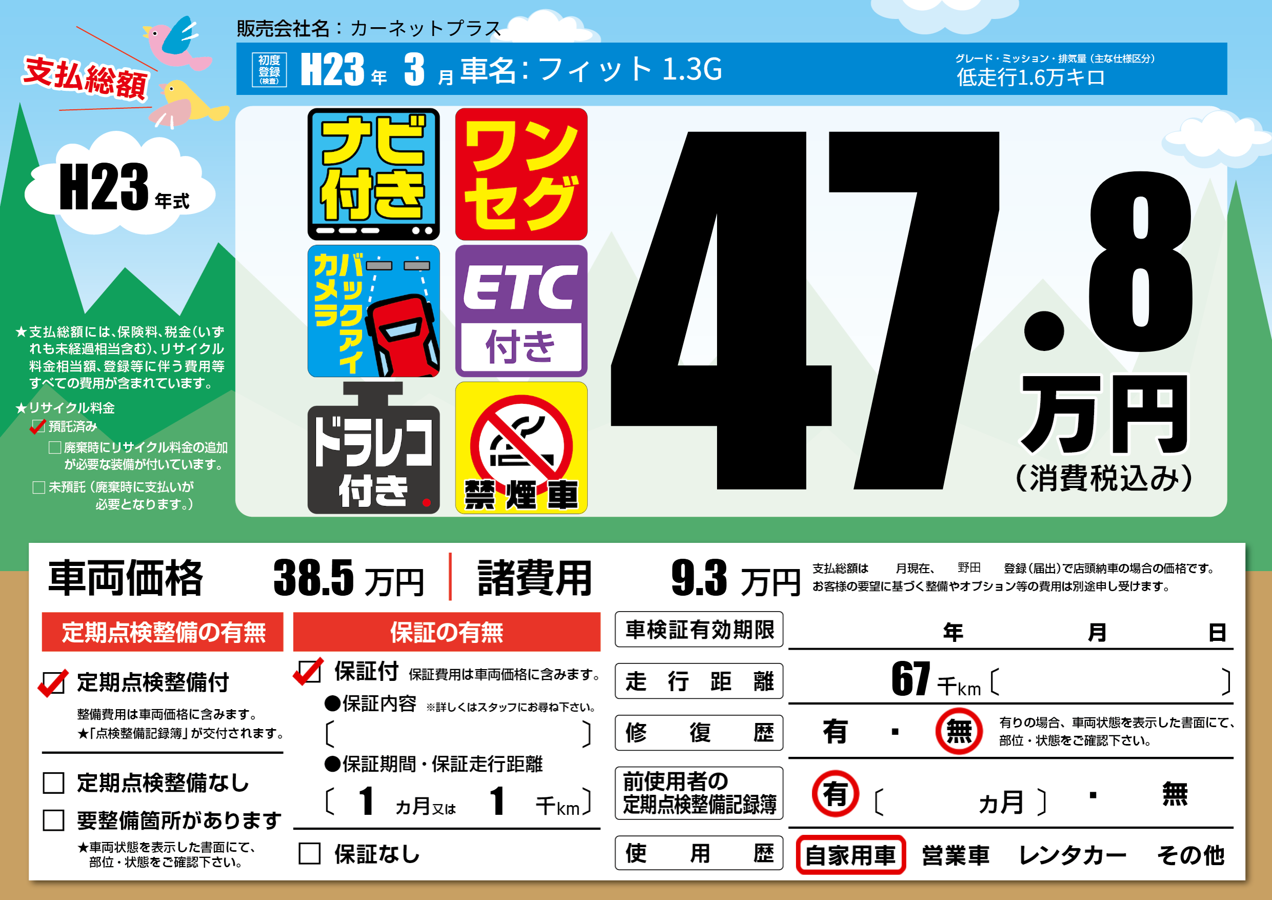 | 走行キロ | 6.7万km | 初年度登録 | H23年3月 |