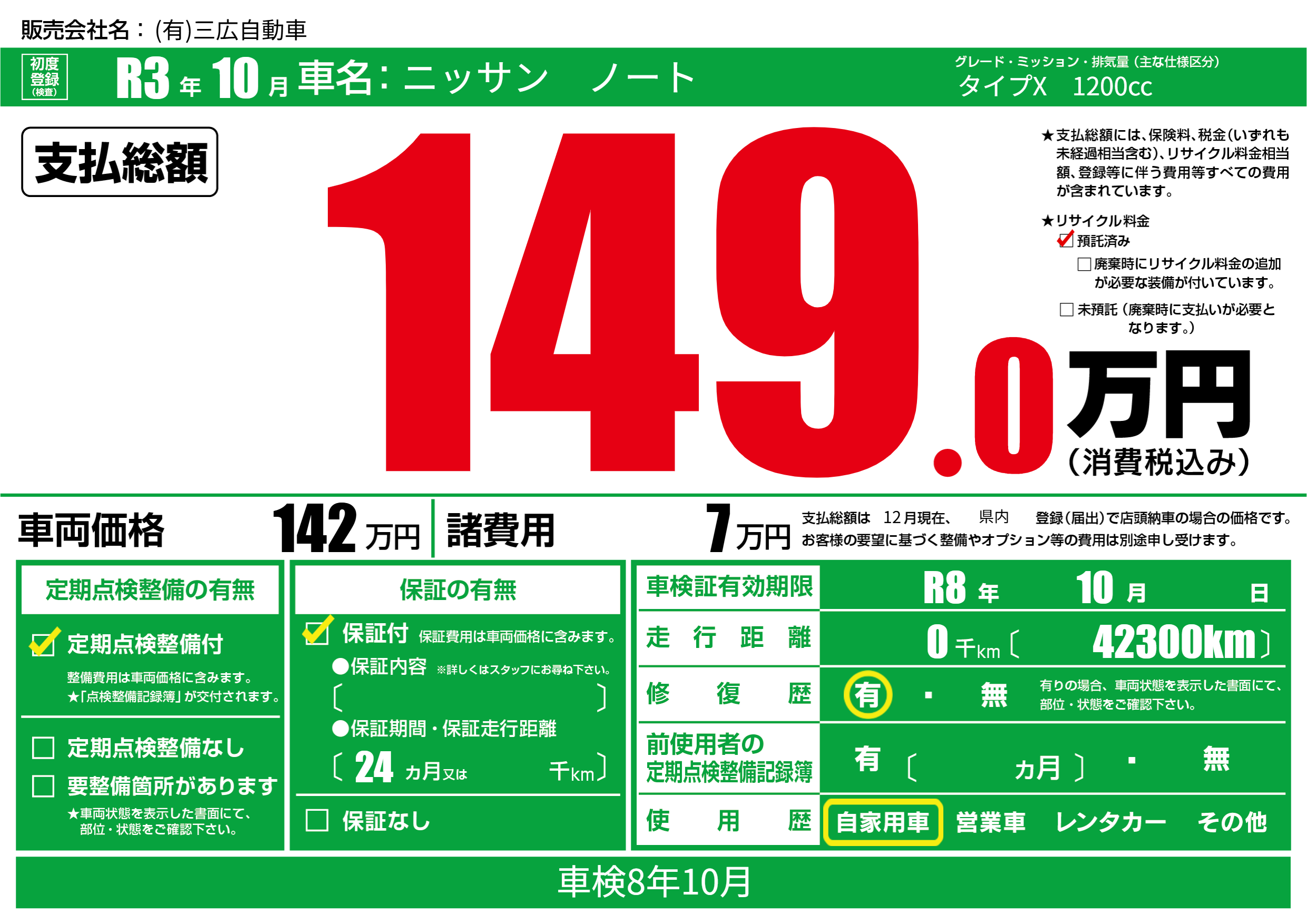 | 車名 | ニッサン ノート | グレード ミッション 排気量 |