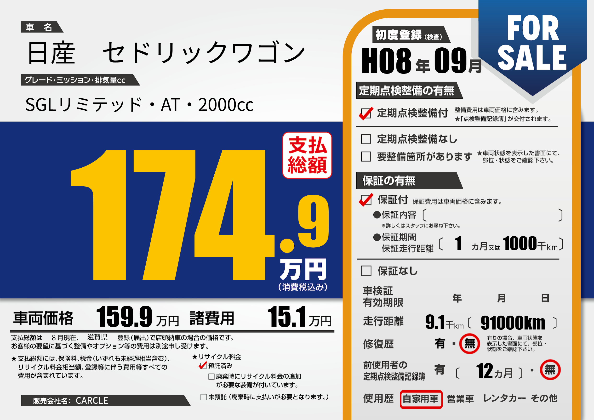 | 車名 | 日産 セドリックワゴン | グレード ミッション 排気量 |