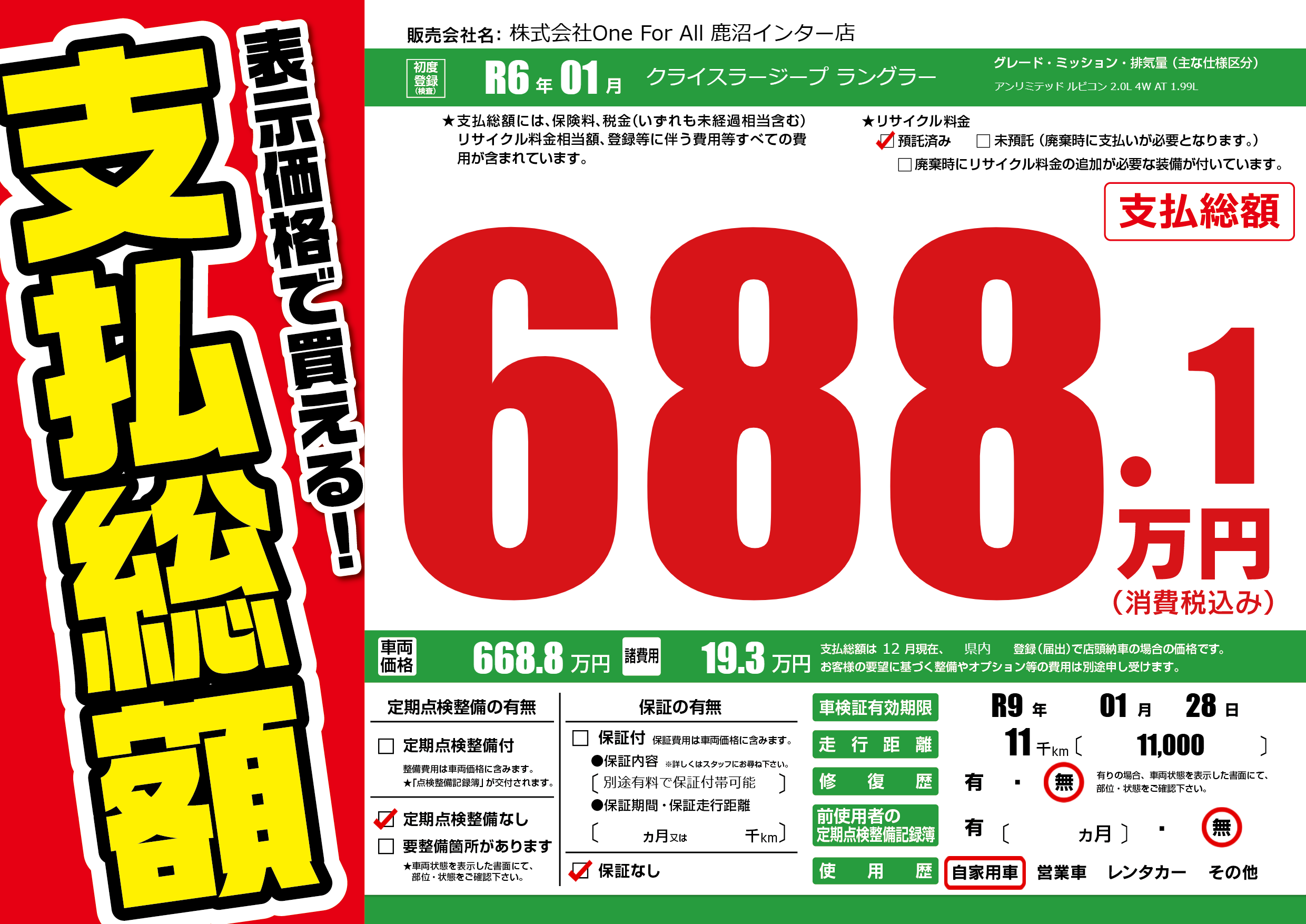 | 走行キロ | 1.1万km | 初年度登録 | R6年01月 |