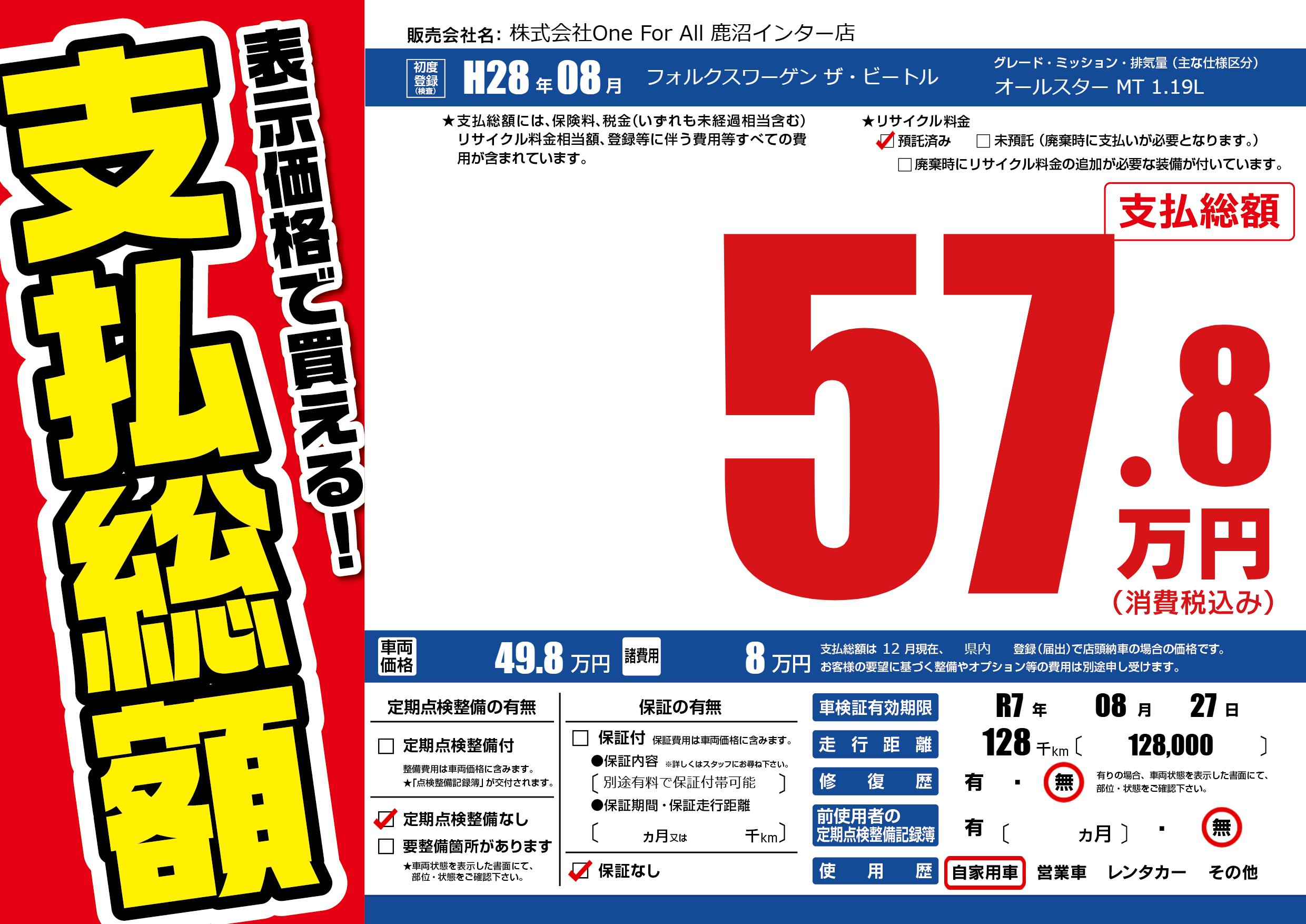 | 走行キロ | 12.8万km | 初年度登録 | H28年08月 |