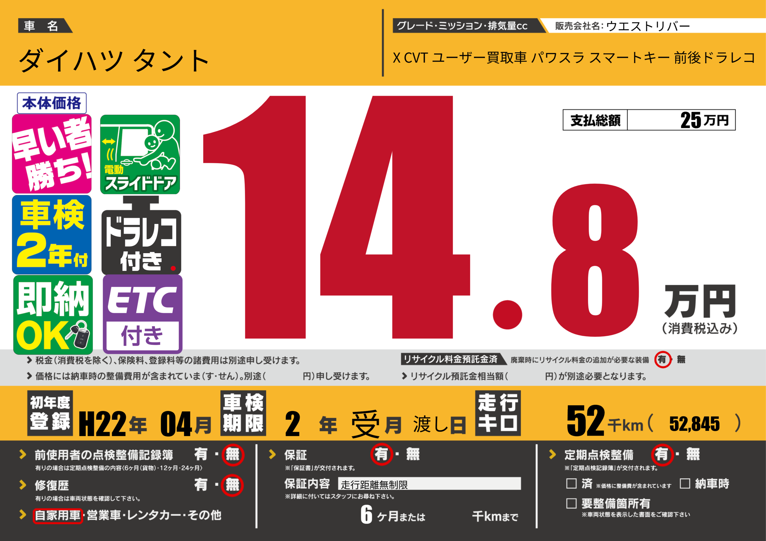 | 走行キロ | 5.2万km | 初年度登録 | H22年04月 |