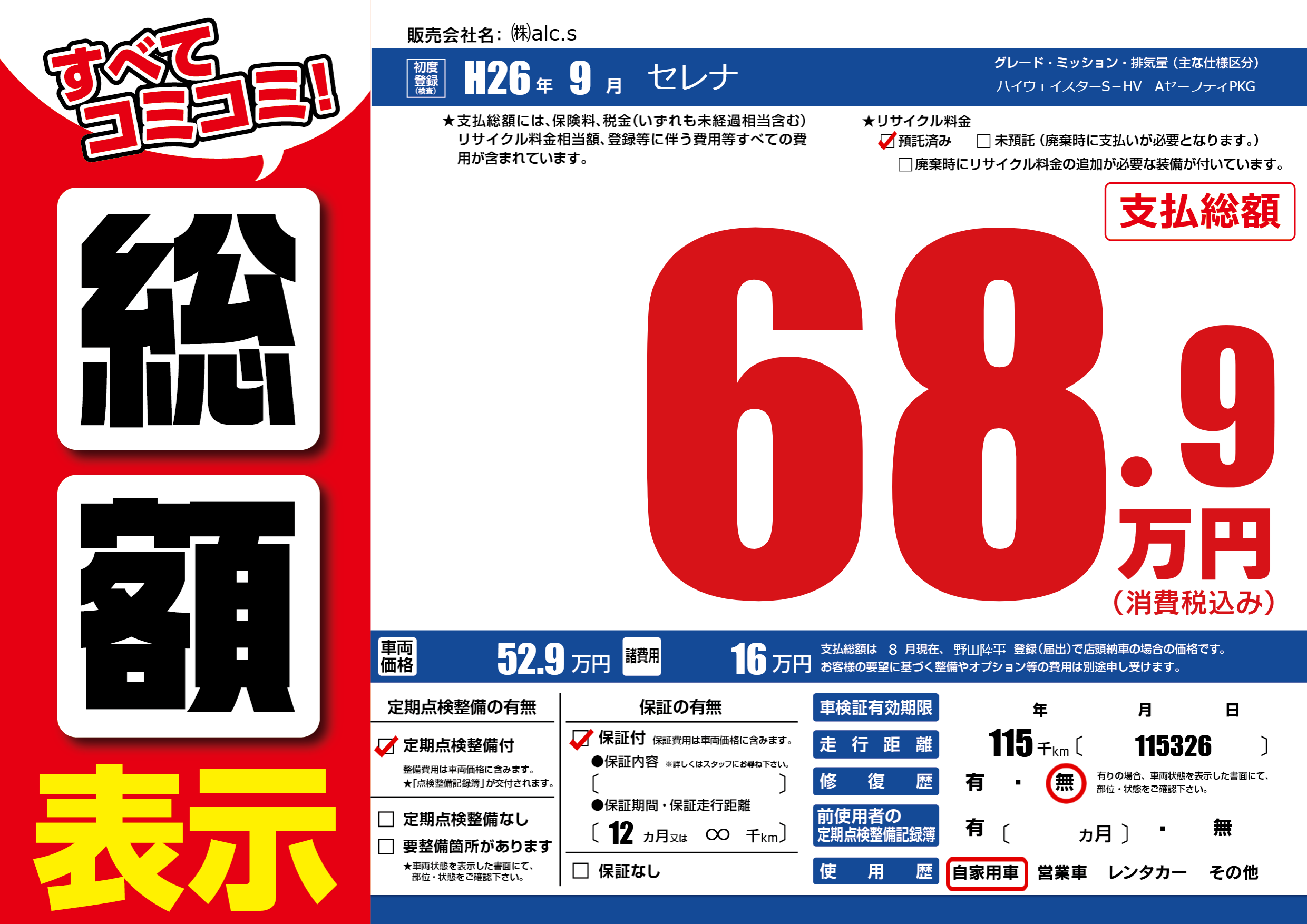| 走行キロ | 11.5万km | 初年度登録 | H26年9月 |