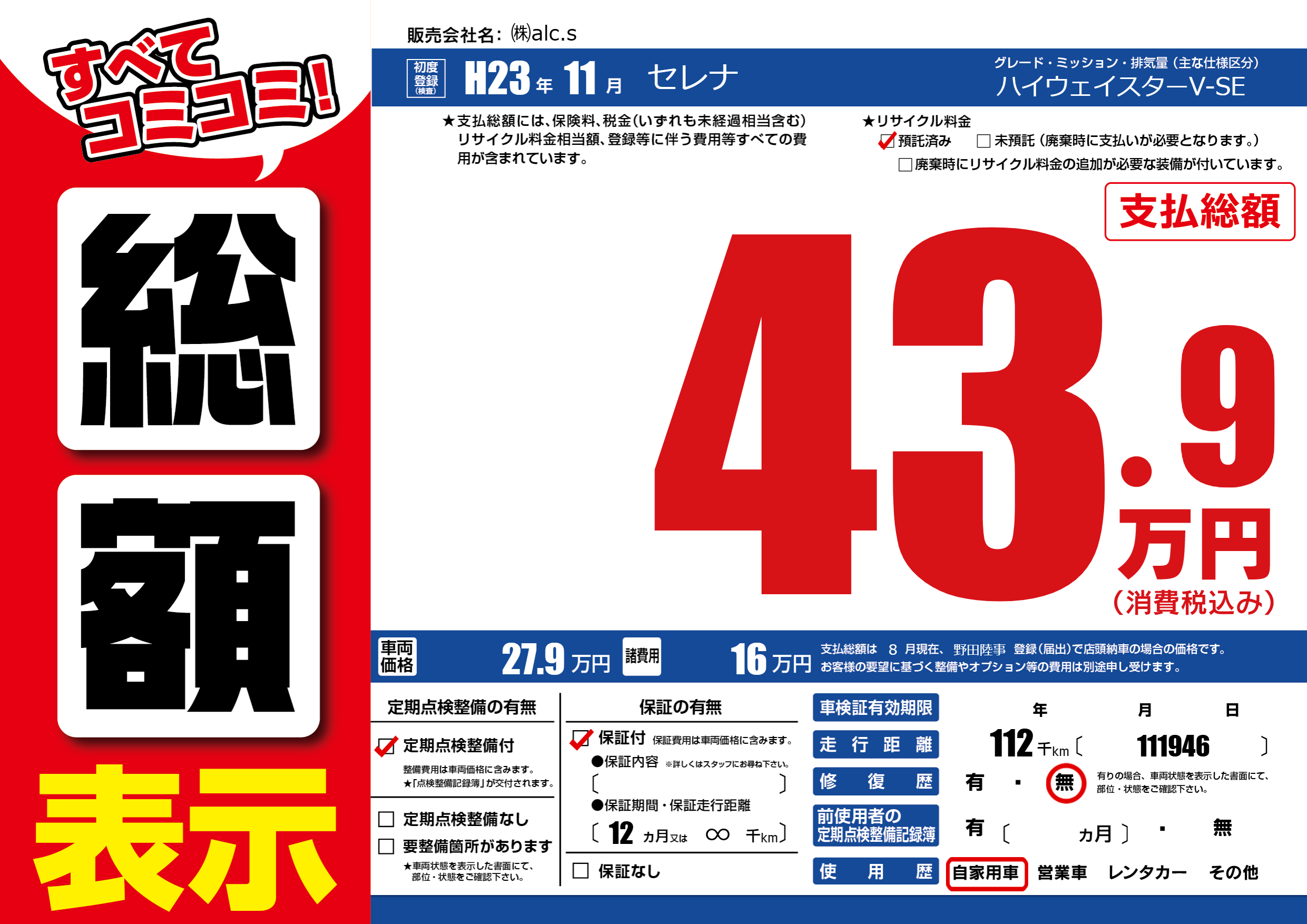 | 走行キロ | 11.2万km | 初年度登録 | H23年11月 |