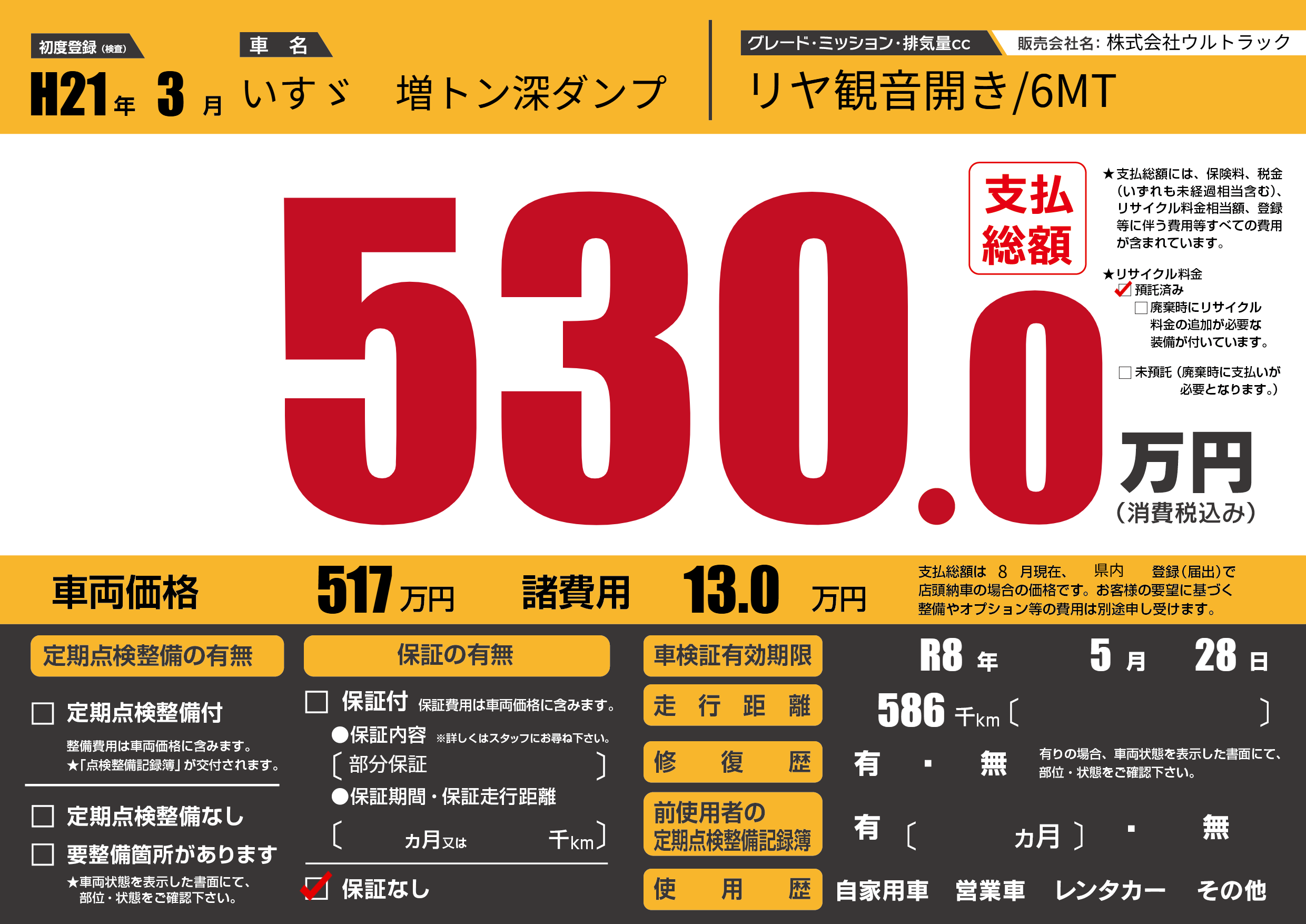 | 車名 | いすゞ 増トン深ダンプ | グレード ミッション 排気量 |
