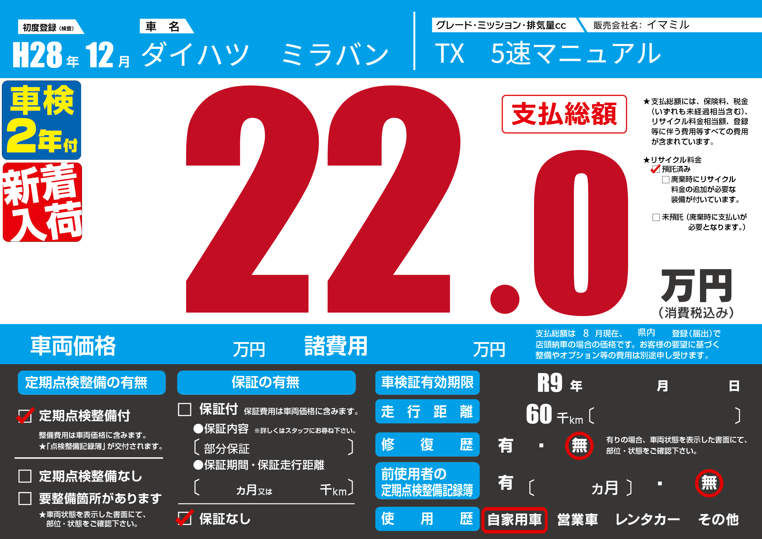 | 車名 | ダイハツ ミラバン | グレード ミッション 排気量 |