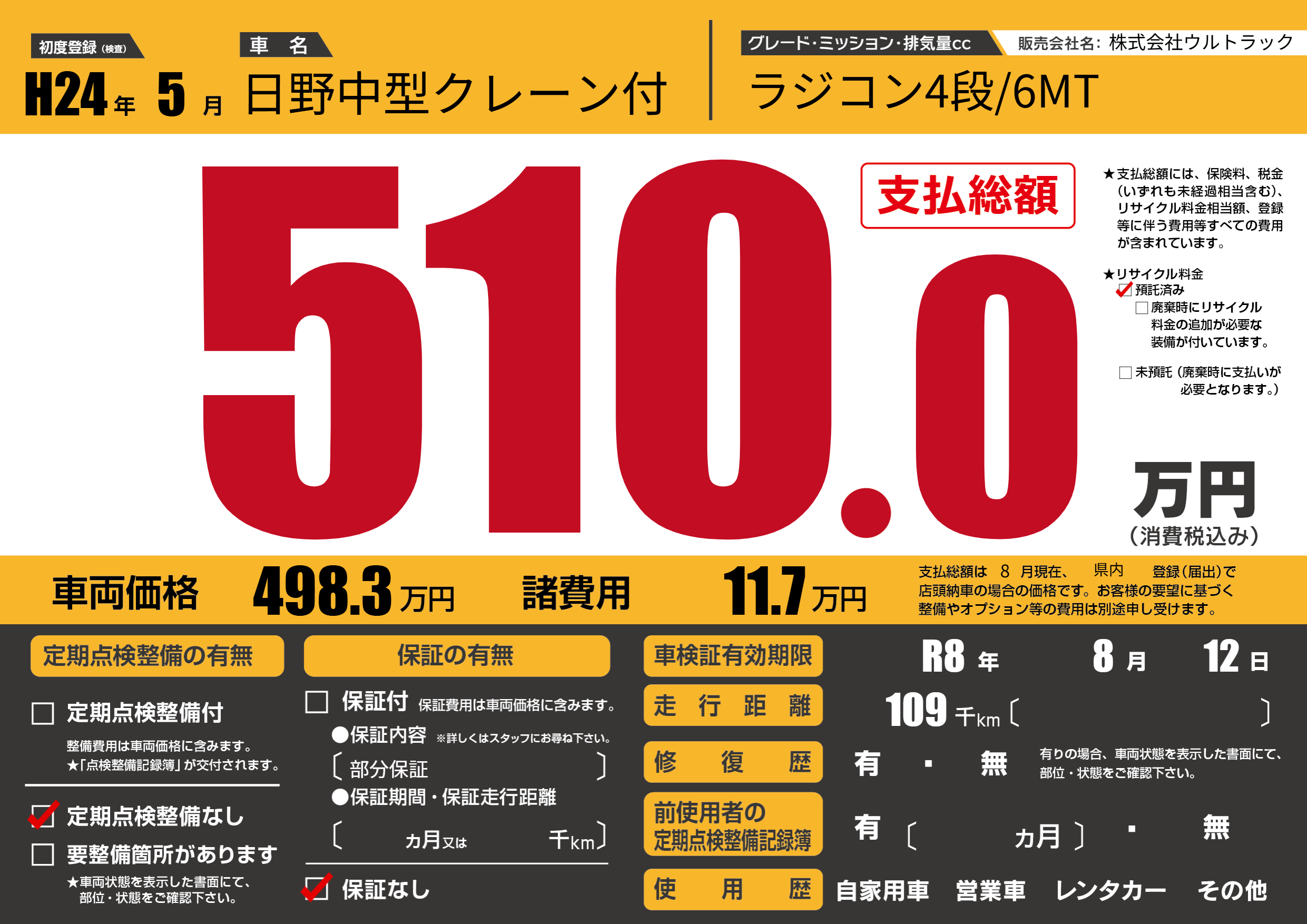 | 車名 | 日野中型クレーン付 | グレード ミッション 排気量 |