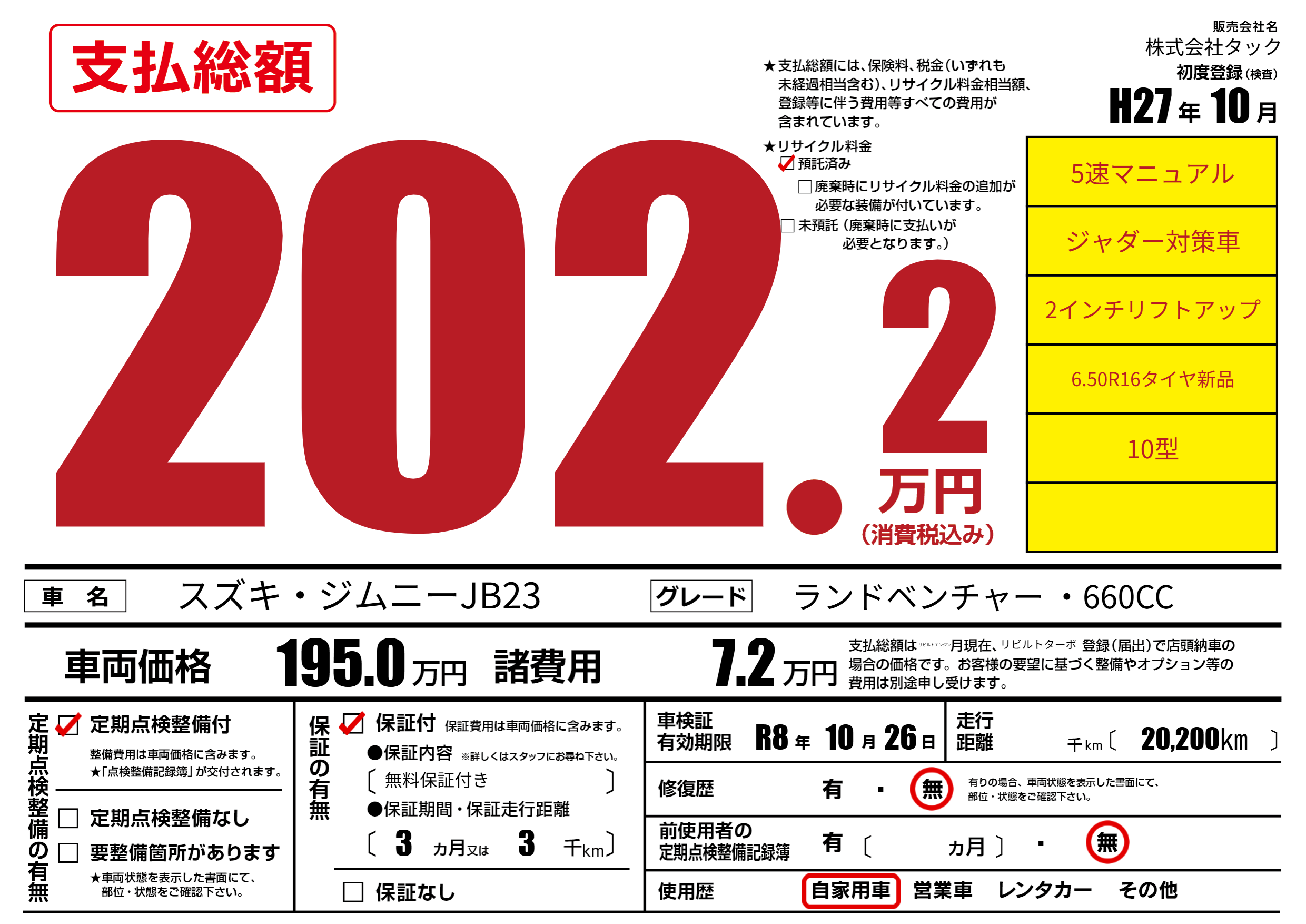 なし | 車検制限 | R8年10月26月 |