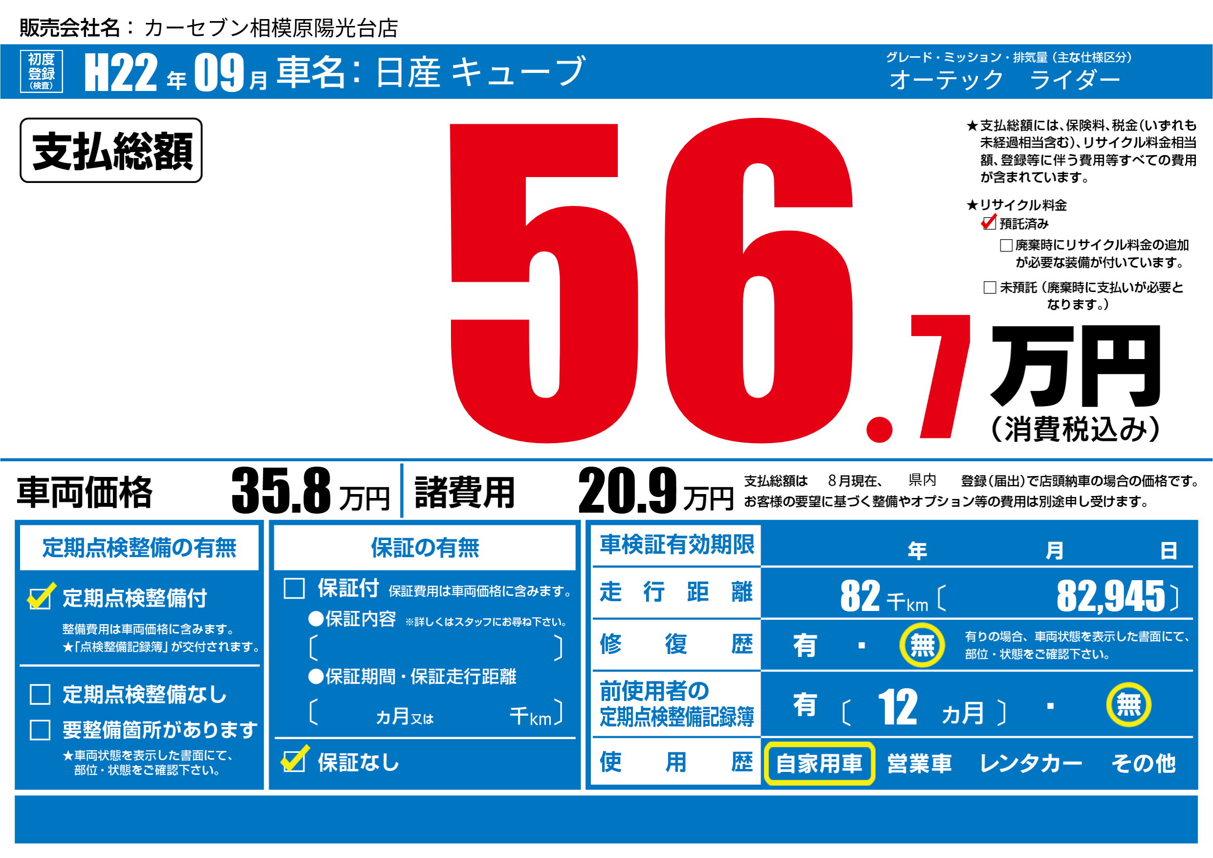 | 車名 | 日産 キューブ | グレード ミッション 排気量 |