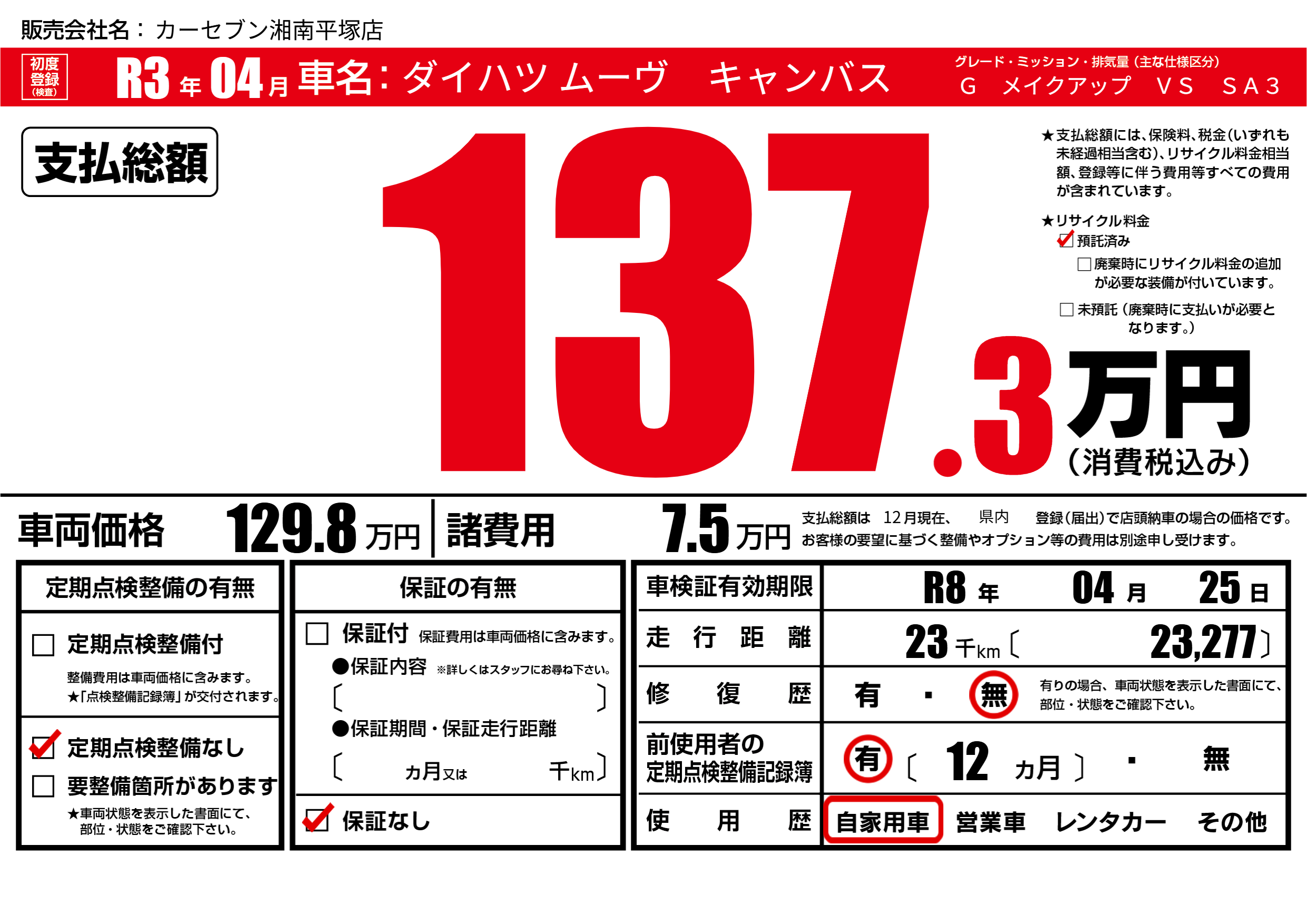| 走行キロ | 2.3万km | 初年度登録 | R3年04月 |