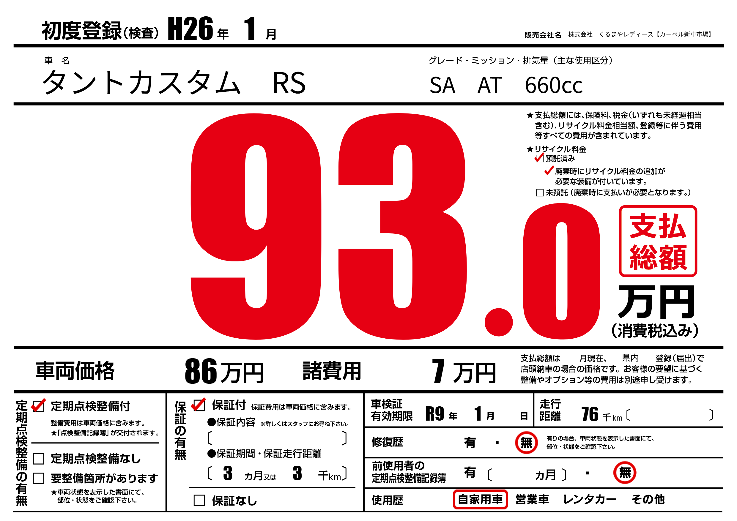 | 走行キロ | 7.6万km | 初年度登録 | H26年1月 |