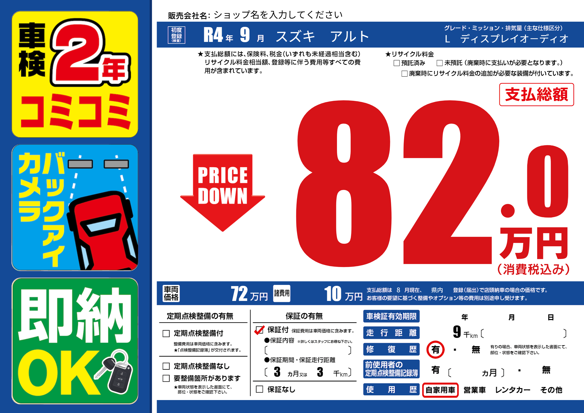 | 車名 | スズキ アルト | グレード ミッション 排気量 |