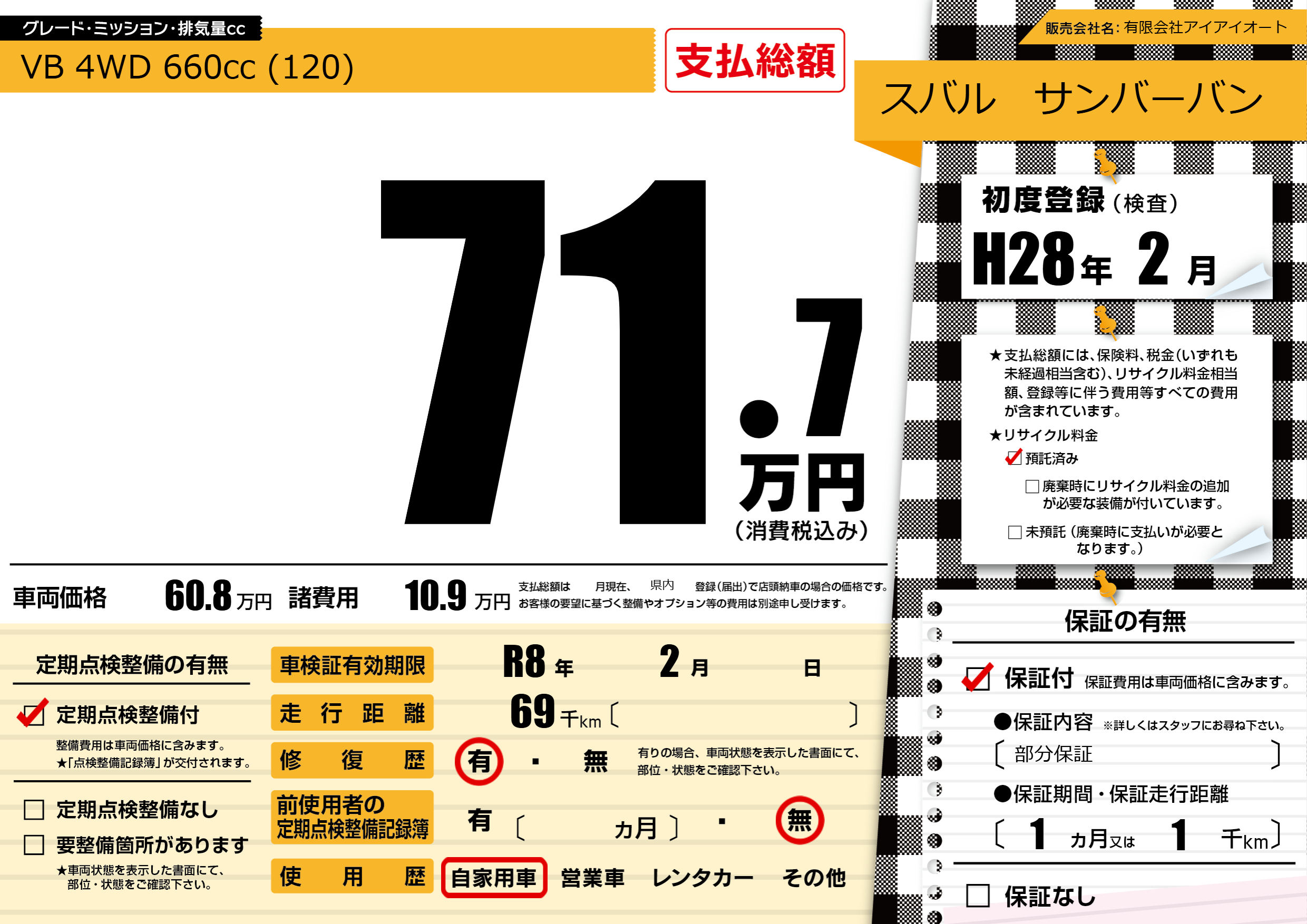 | 車名 | スバル サンバーバン | グレード ミッション 排気量 |