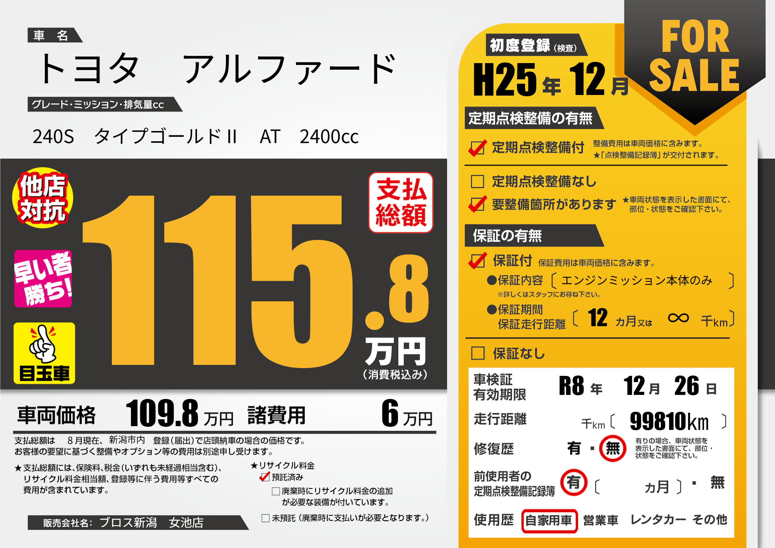| 車名 | トヨタ アルファード | グレード ミッション 排気量 |