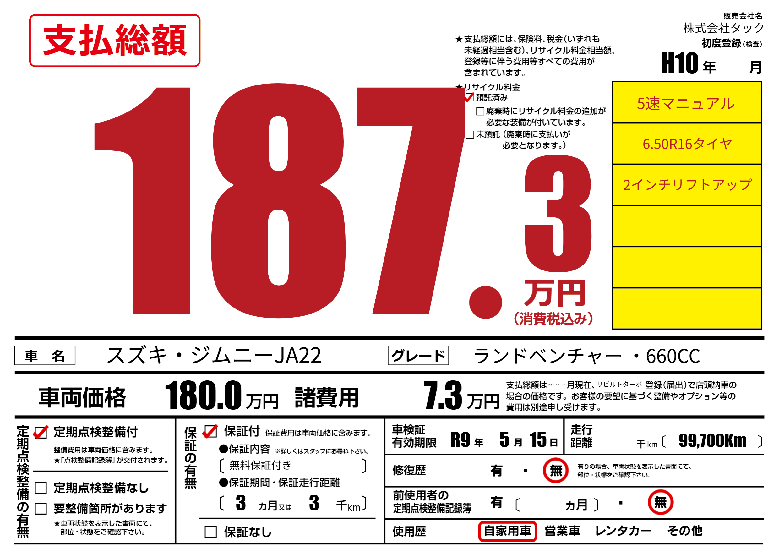 | 車名 | スズキ・ジムニーJA22 | グレード ミッション 排気量 |