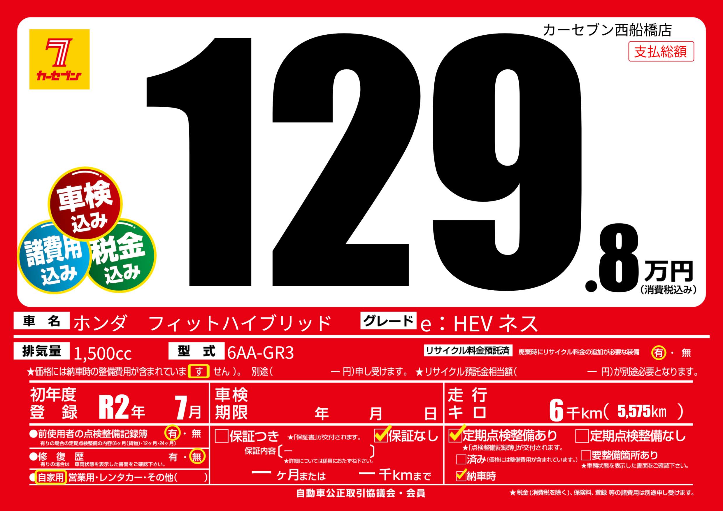 | 車名 | ホンダ フィットハイブリッド | グレード ミッション 排気量 |