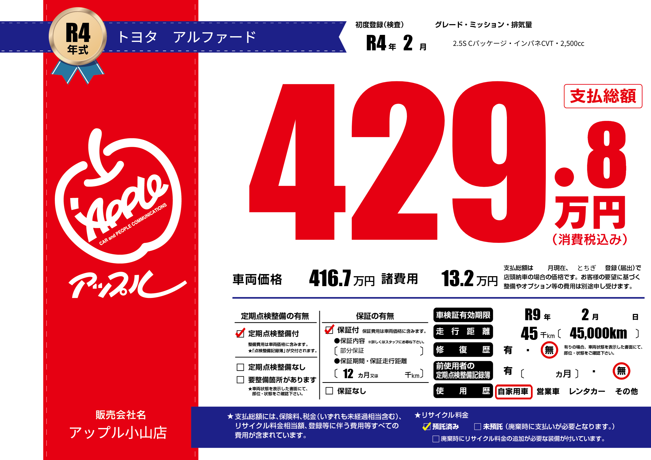 | 走行キロ | 4.5万km | 初年度登録 | R4年2月 |
