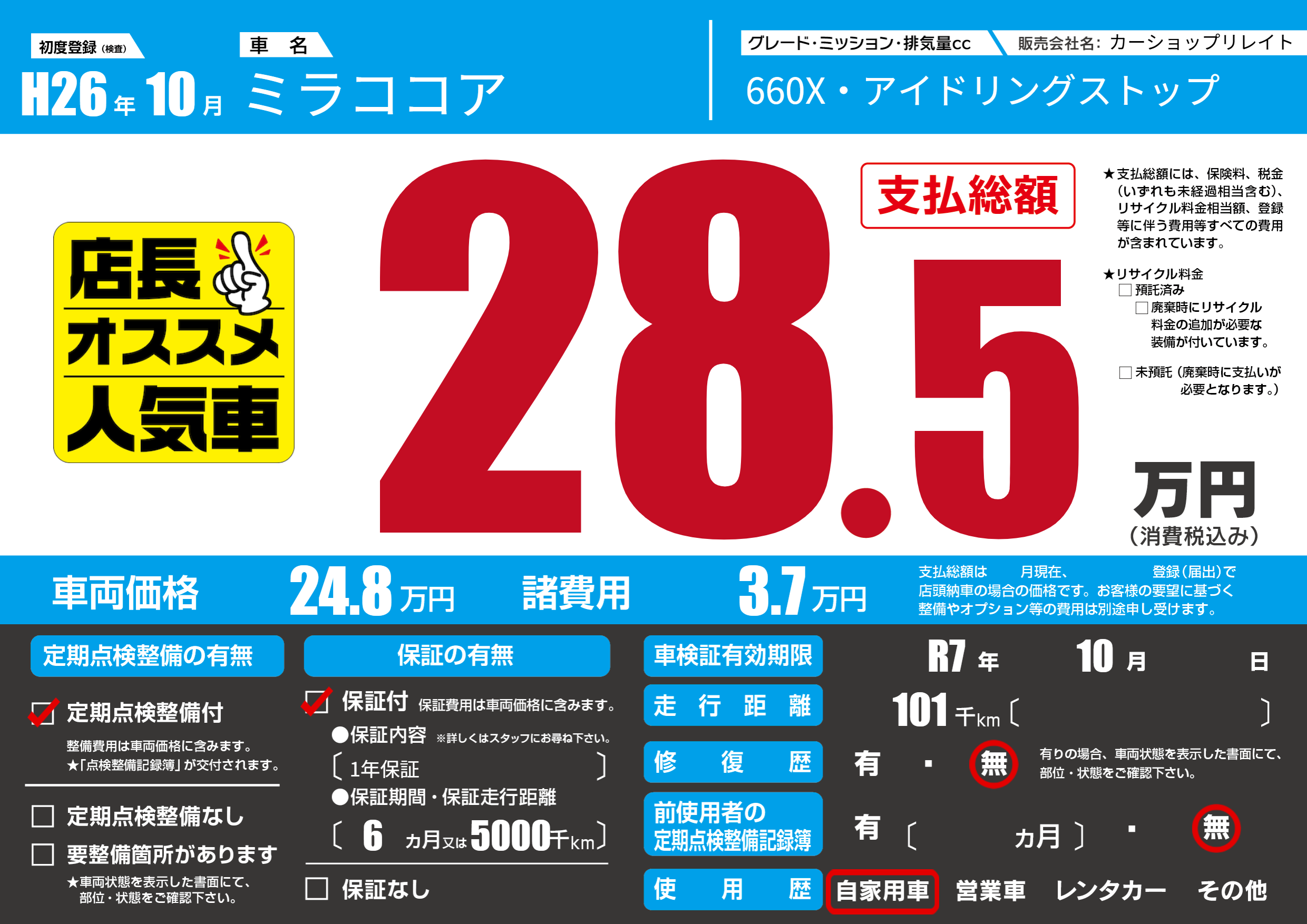 | 走行キロ | 10.1万km | 初年度登録 | H26年10月 |