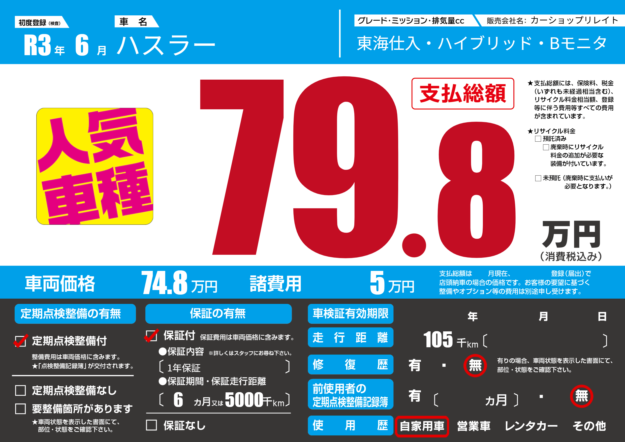 保証付き 保証内容(1年保証) 6ヶ月または(5000)千kmまで |