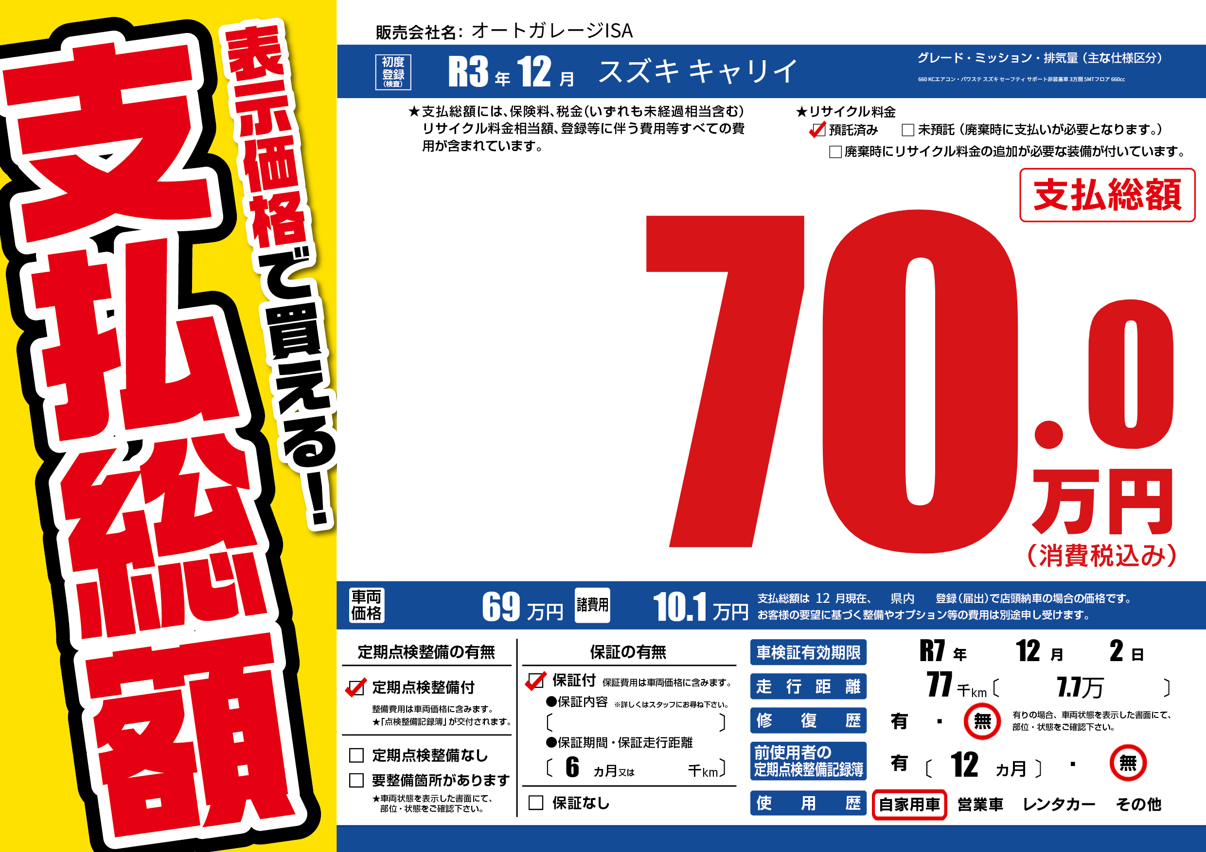 | 走行キロ | 7.7万km | 初年度登録 | R3年12月 |