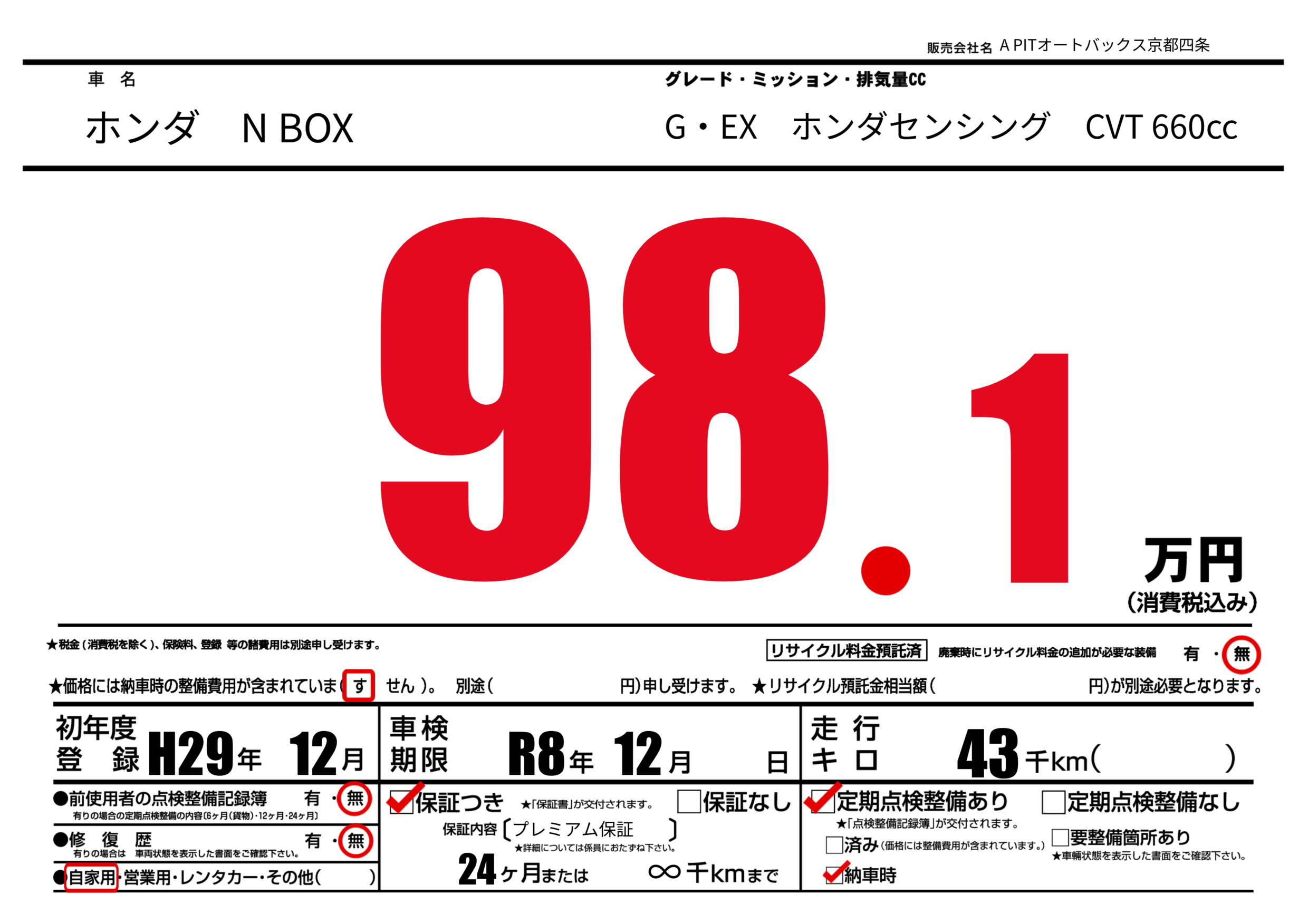 | 車検制限 | R8年 12月 - 日 | ||