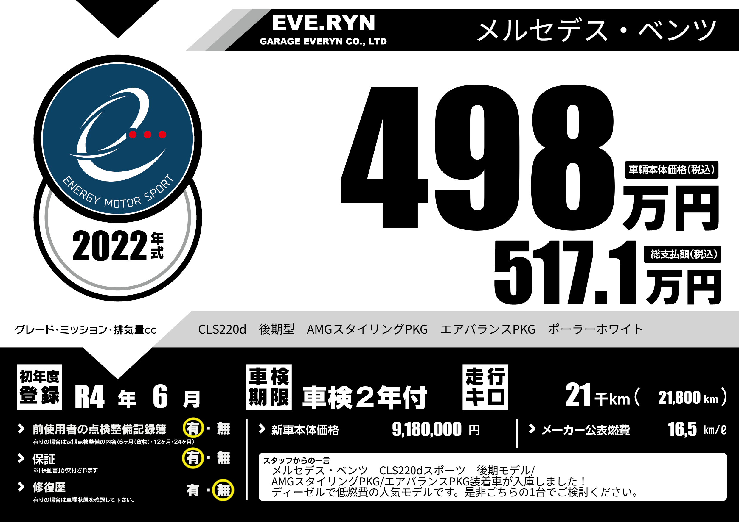CLS220d 後期型 AMGスタイリングPKG エアバランスPKG ポーラーホワイト |