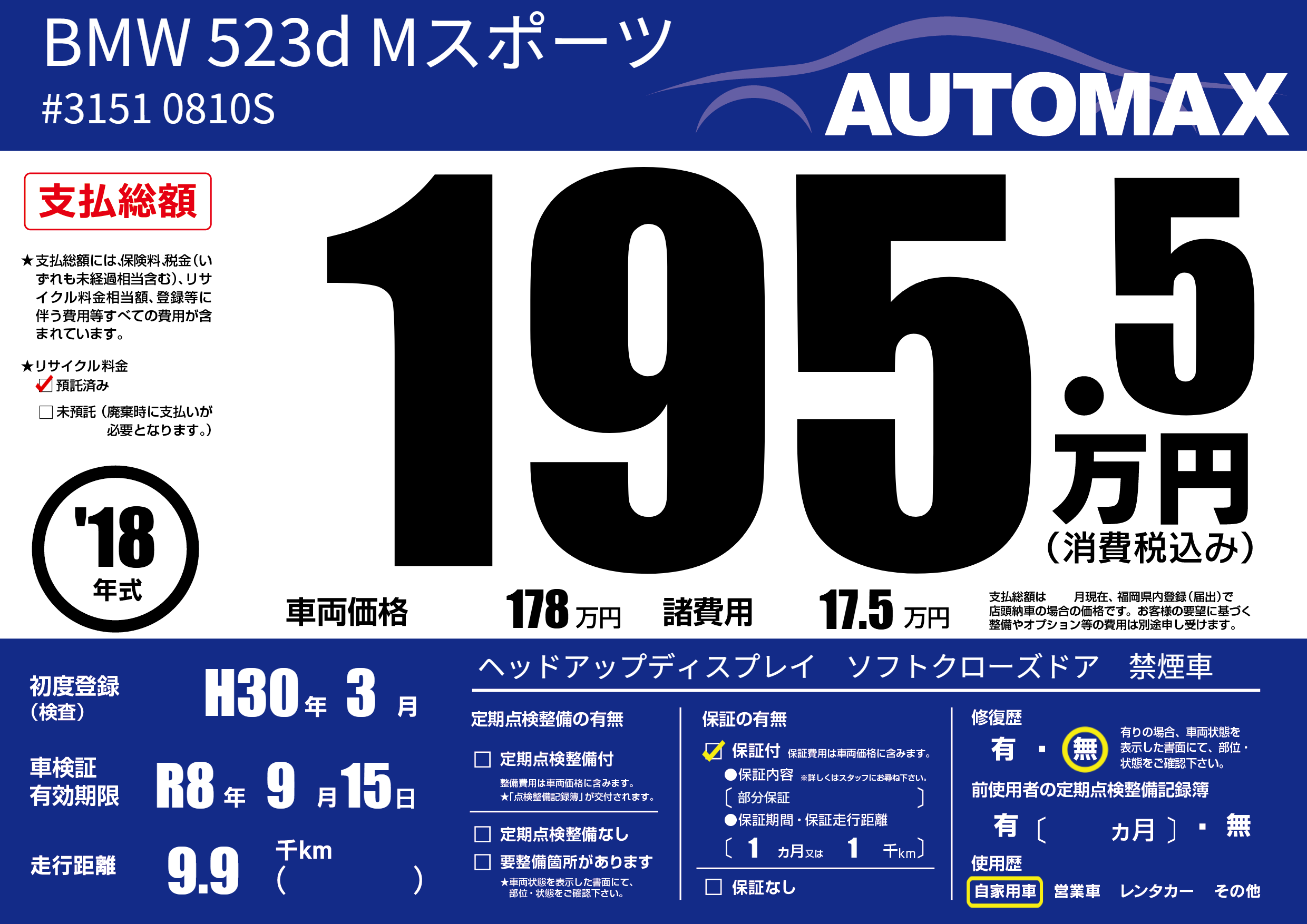| 車名 | BMW 523d Mスポーツ | グレード ミッション 排気量 |