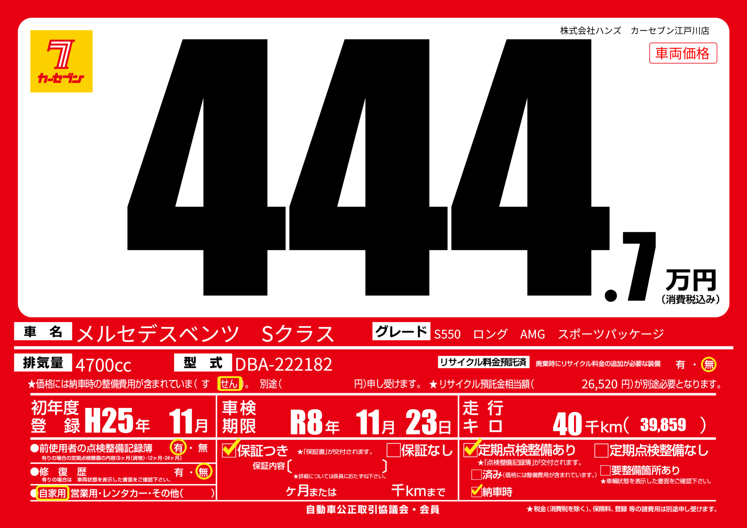 | 車名 | メルセデスベンツ Sクラス | グレード ミッション 排気量 |