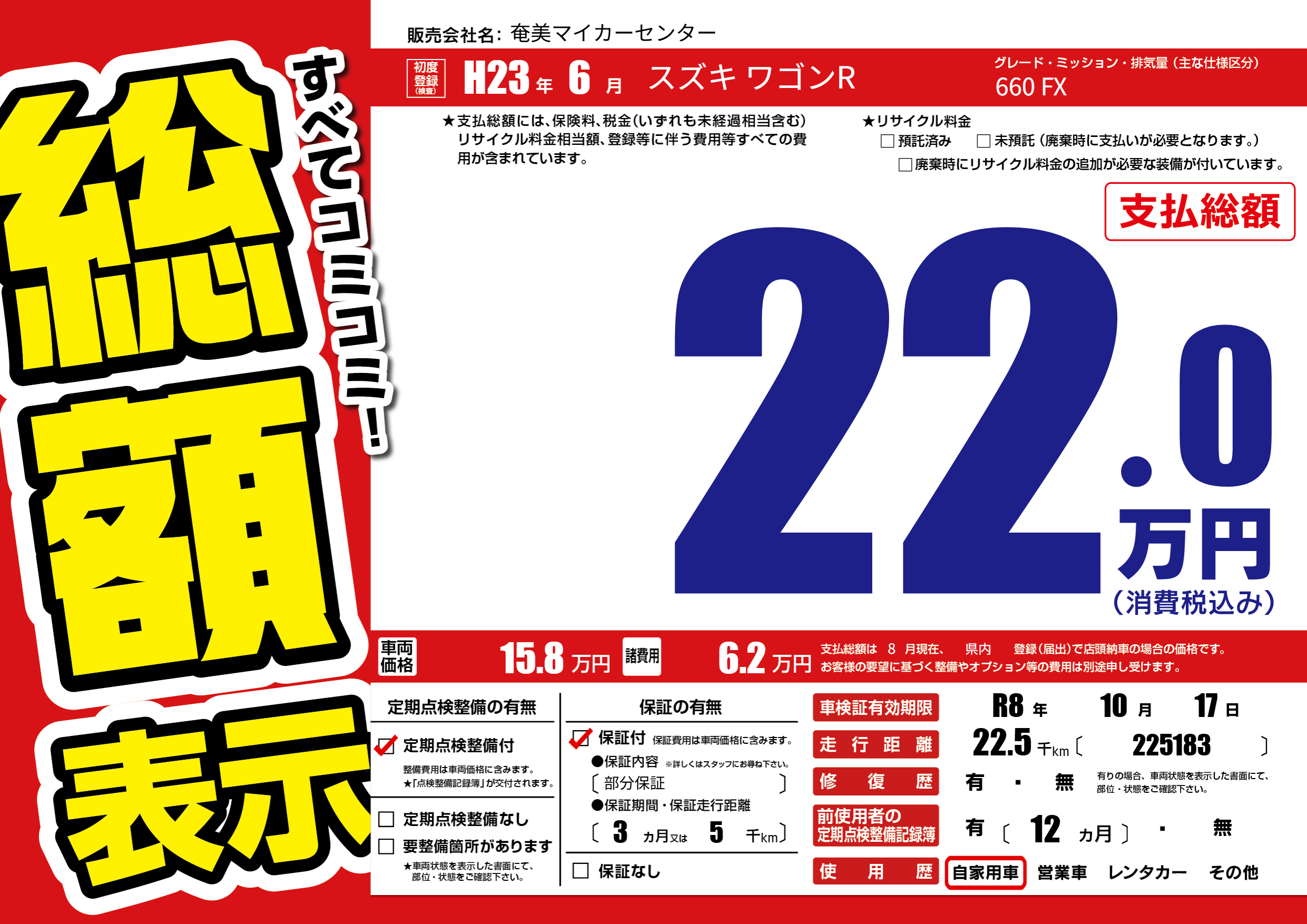 | 走行キロ | 2.2万km | 初年度登録 | H23年6月 |