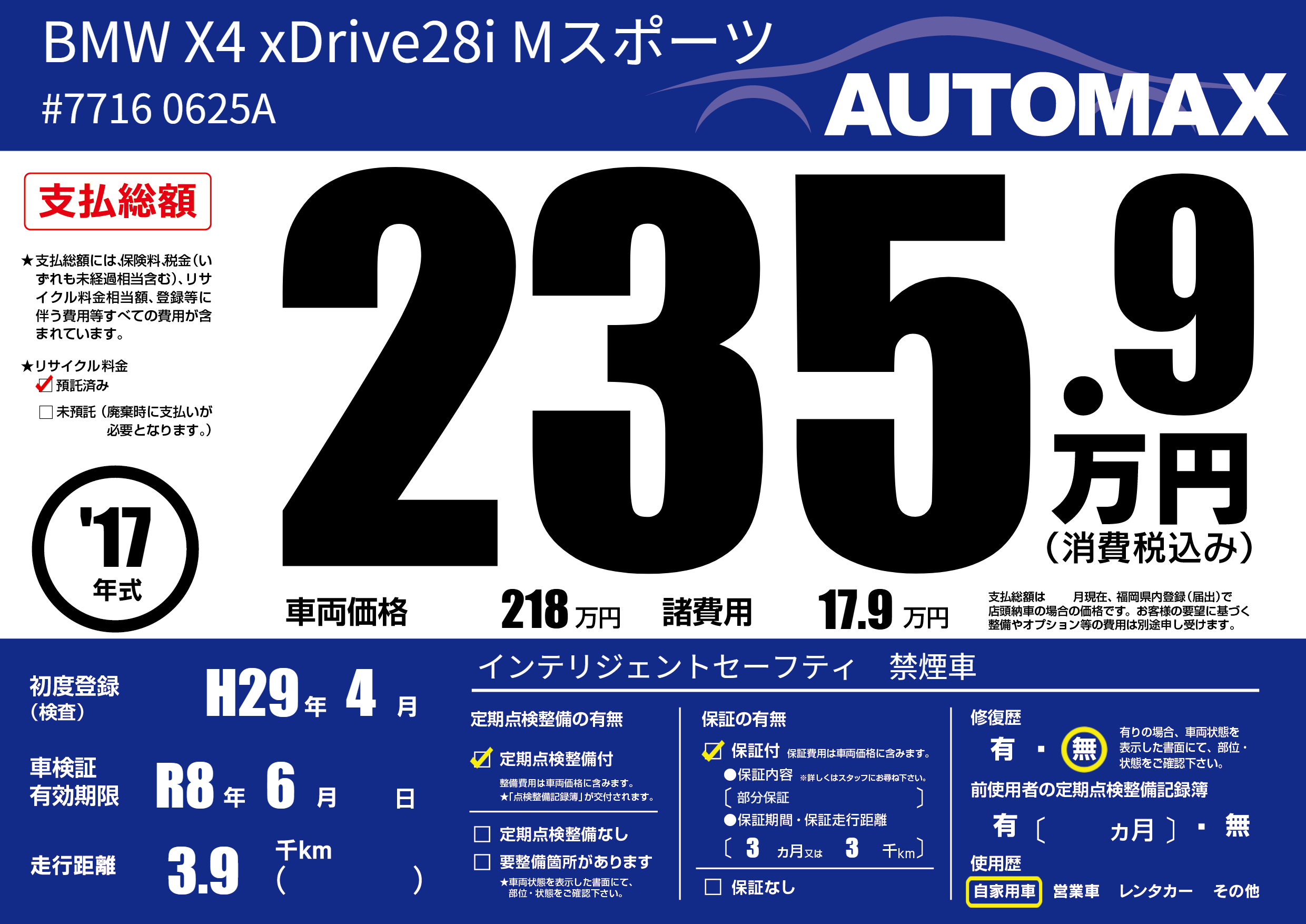 | 車名 | BMW X4 xDrive28i Mスポーツ | グレード ミッション 排気量 |