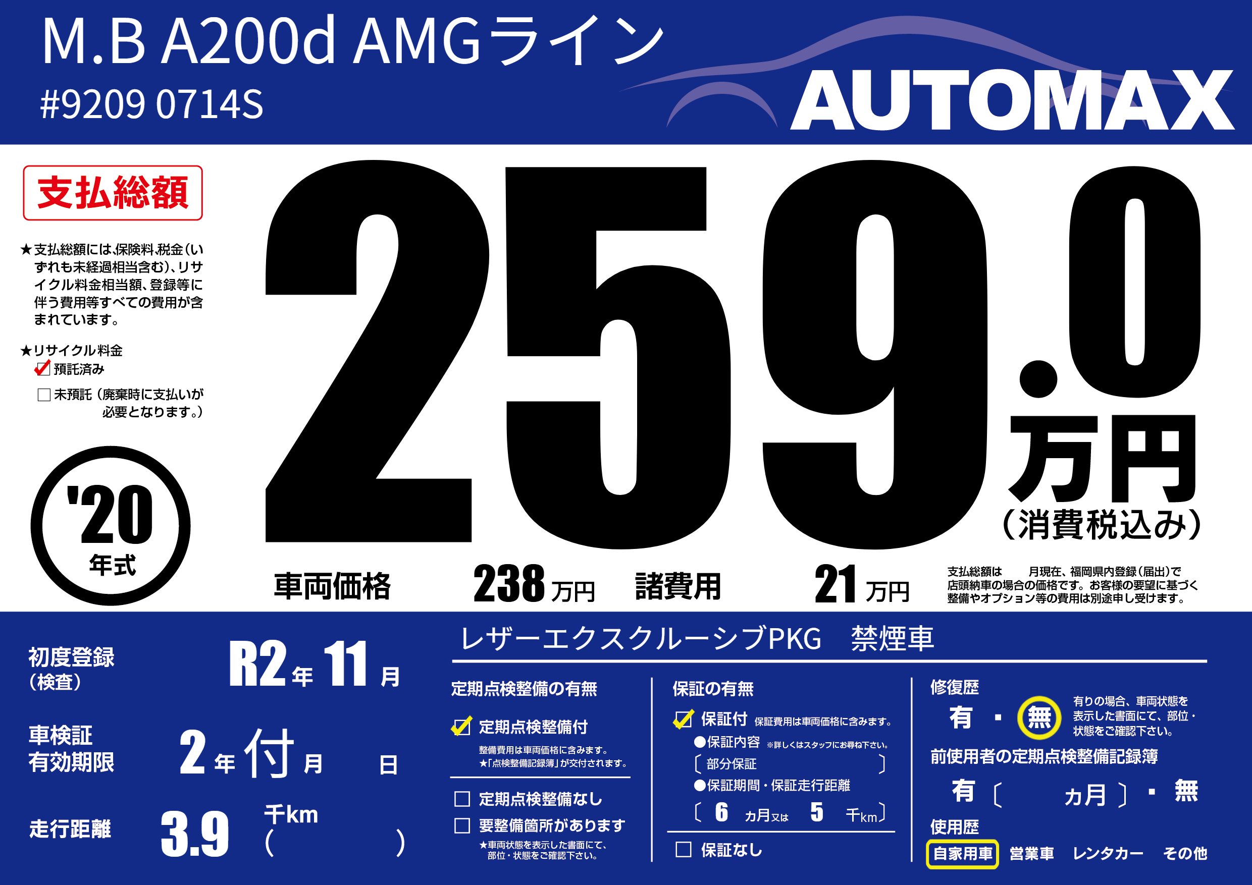 | 車名 | M.B A200d AMGライン | グレード ミッション 排気量 |