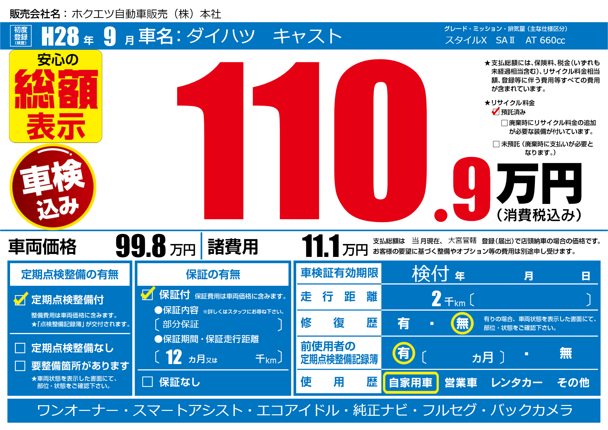 | 車名 | ダイハツ キャスト | グレード ミッション 排気量 |