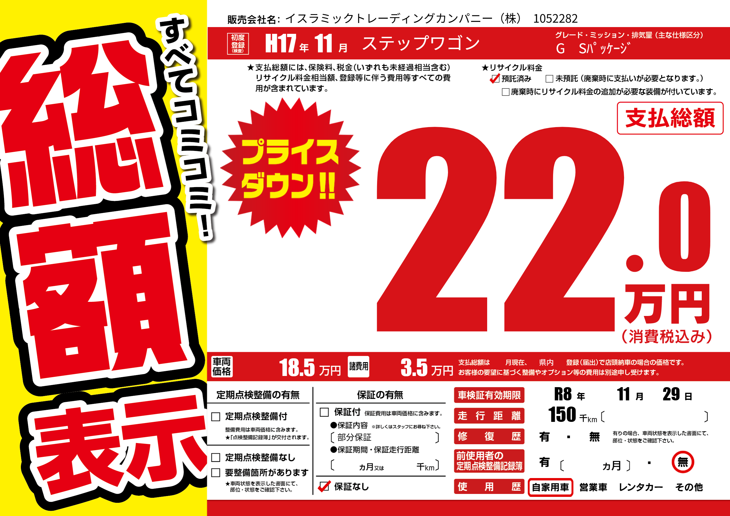 | 走行キロ | 15万km | 初年度登録 | H17年11月 |