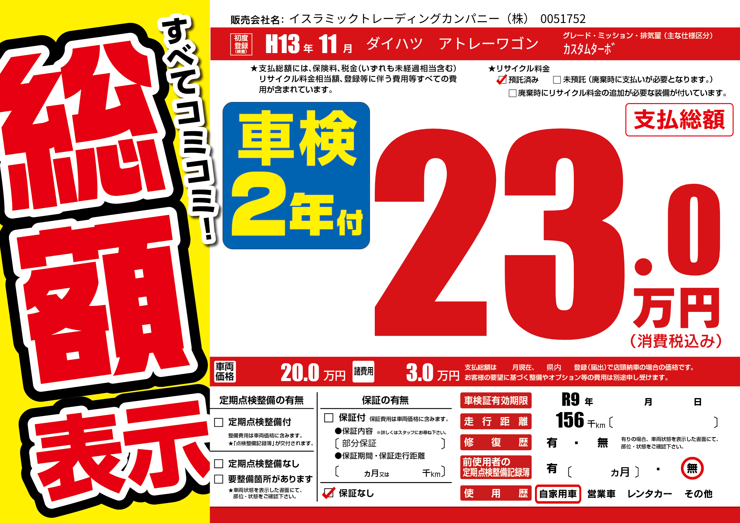| 走行キロ | 15.6万km | 初年度登録 | H13年11月 |