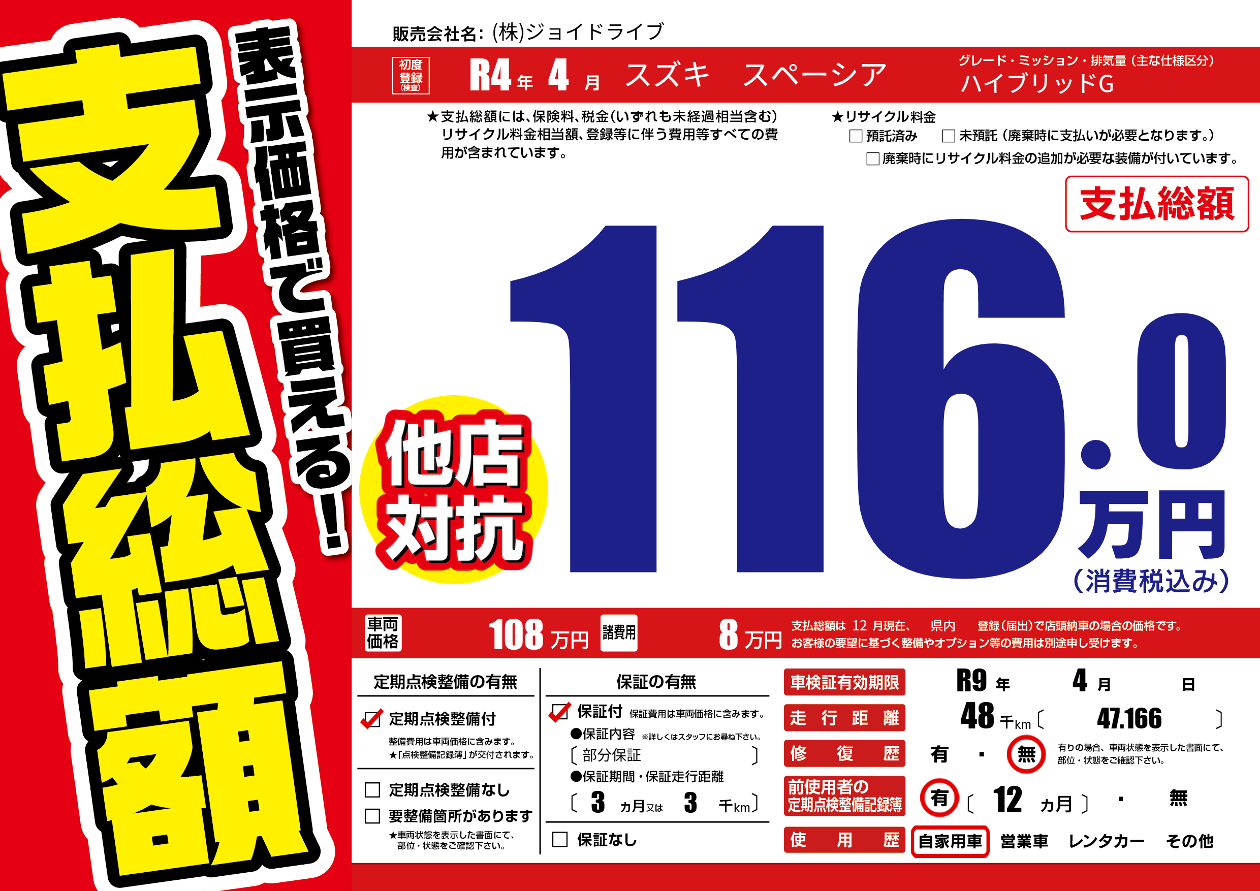 | 走行キロ | 4.8万km | 初年度登録 | R4年4月 |