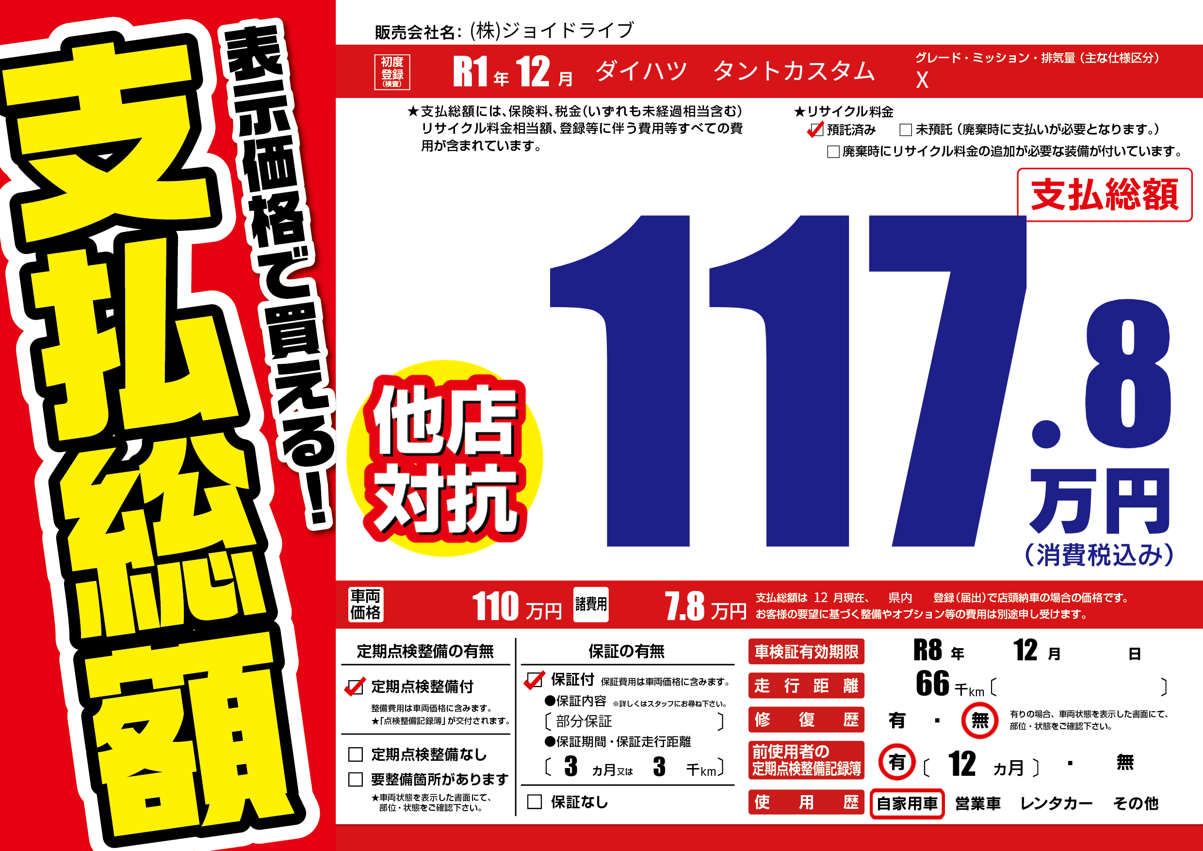 | 車名 | ダイハツ タントカスタム | グレード ミッション 排気量 |