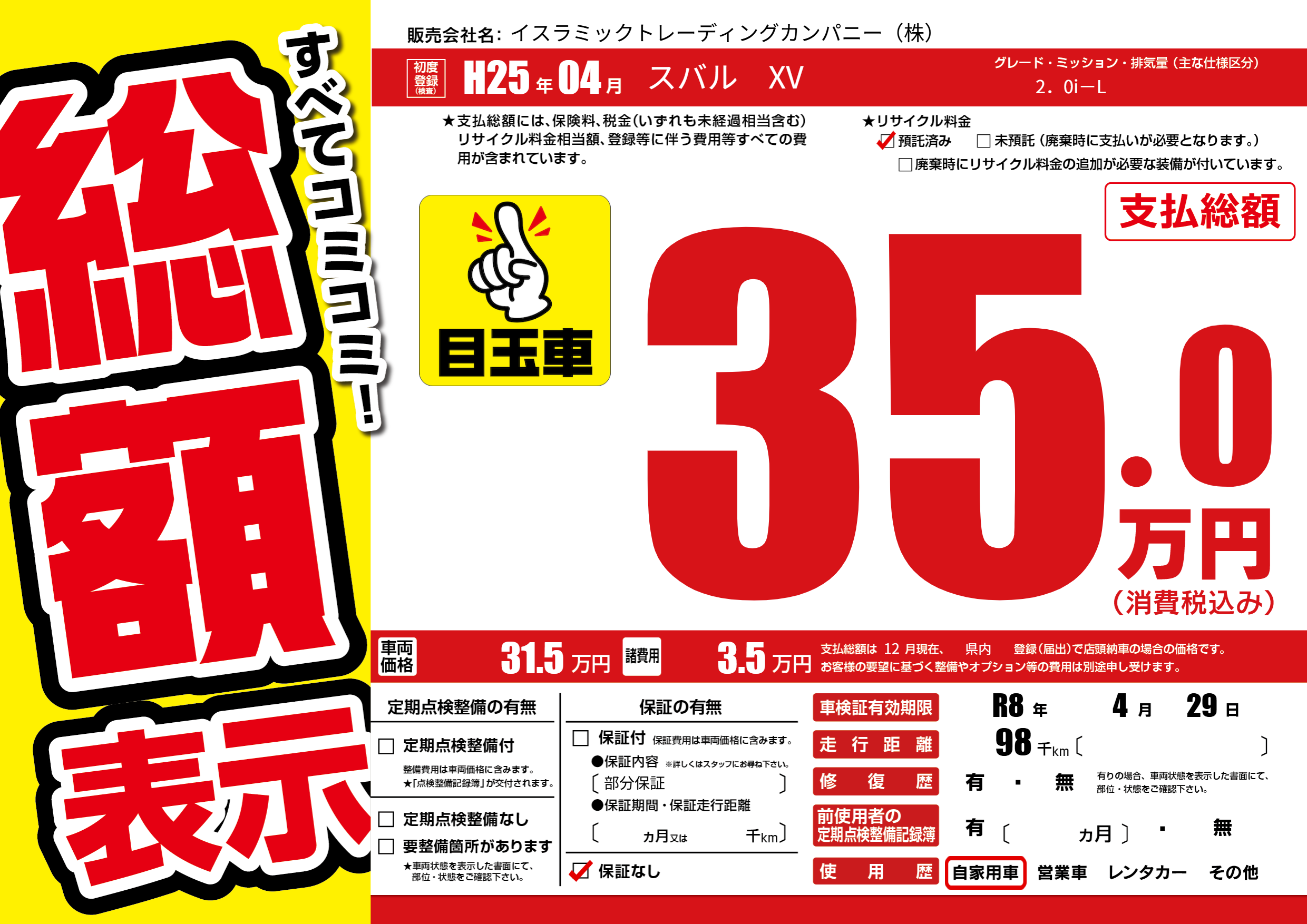 | 車名 | スバル XV | グレード ミッション 排気量 |