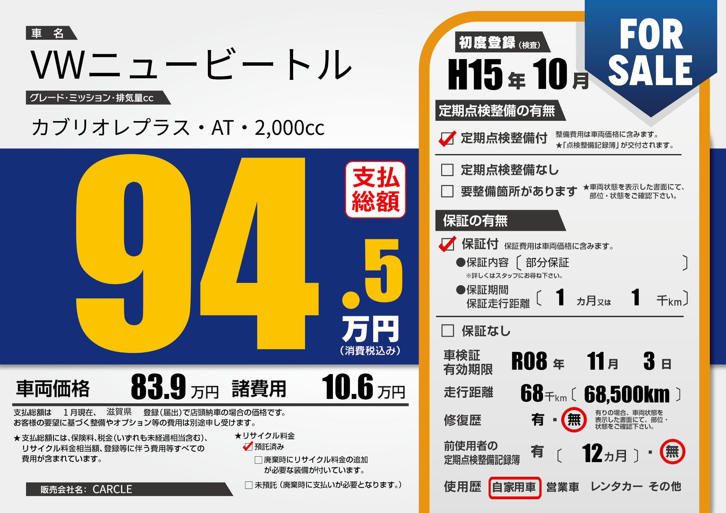 | 車名 | VWニュービートル | グレード ミッション 排気量 |