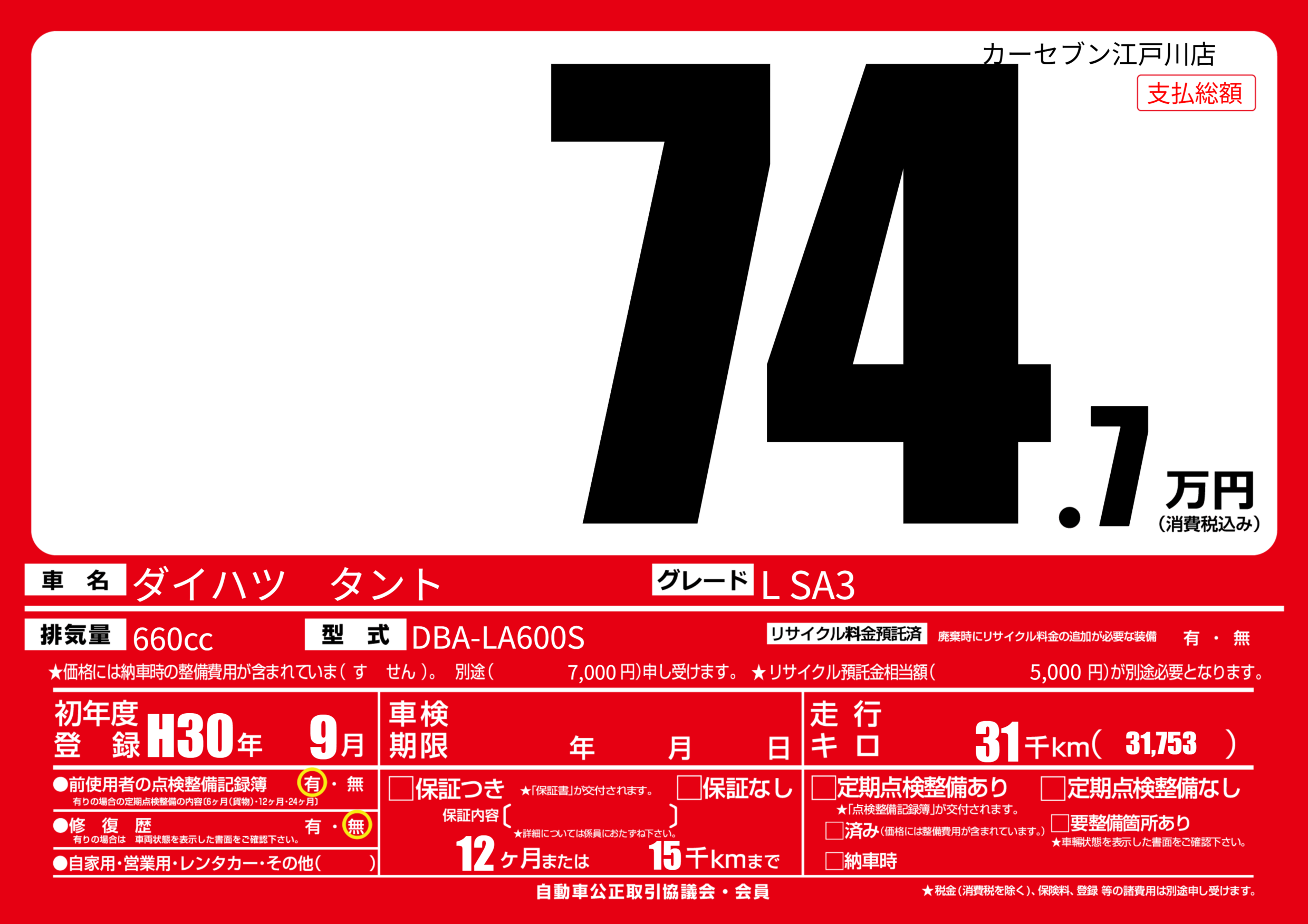 | 車名 | ダイハツ タント | グレード ミッション 排気量 |