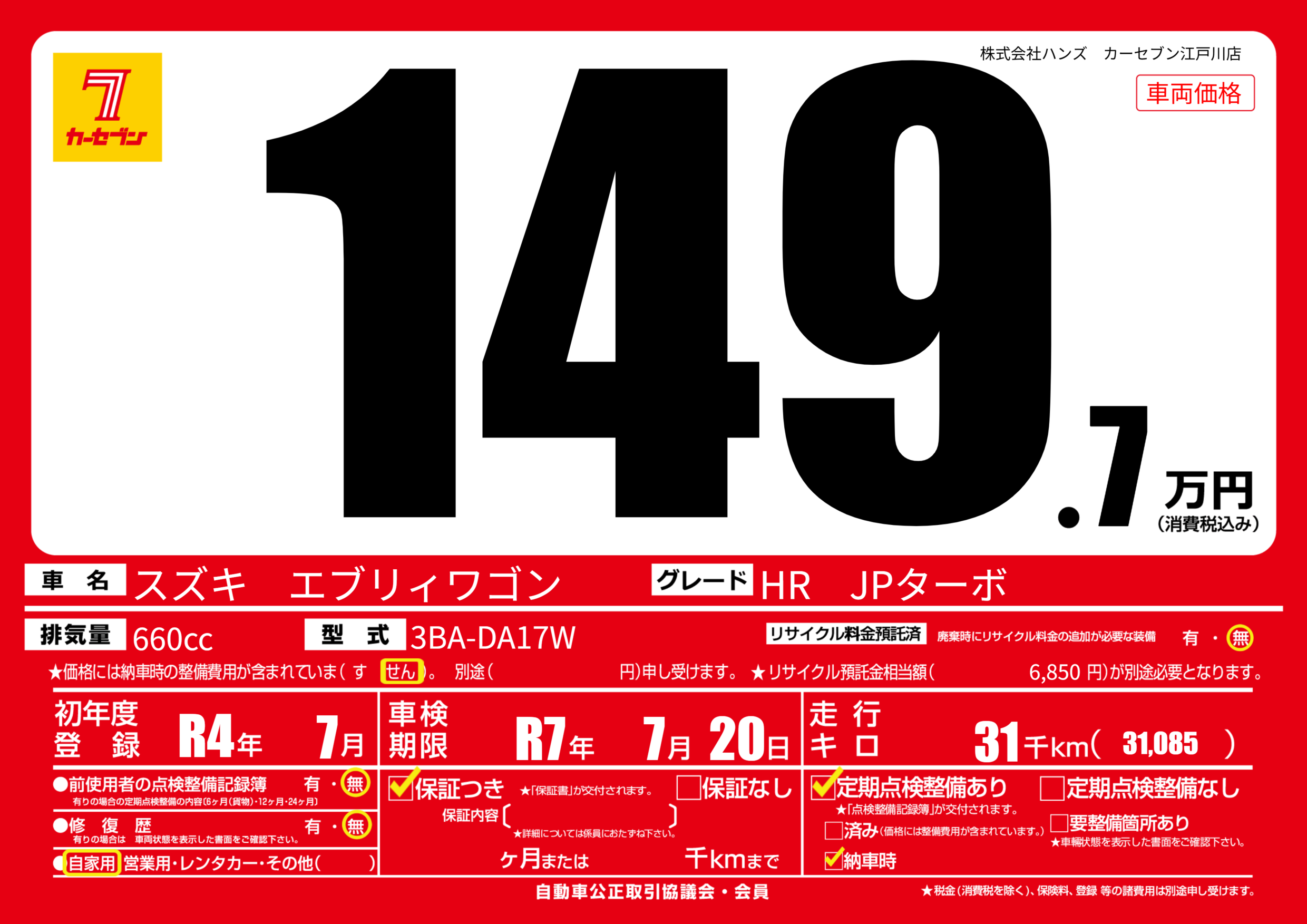 | 走行キロ | 3.1万km | 初年度登録 | R4年7月 |