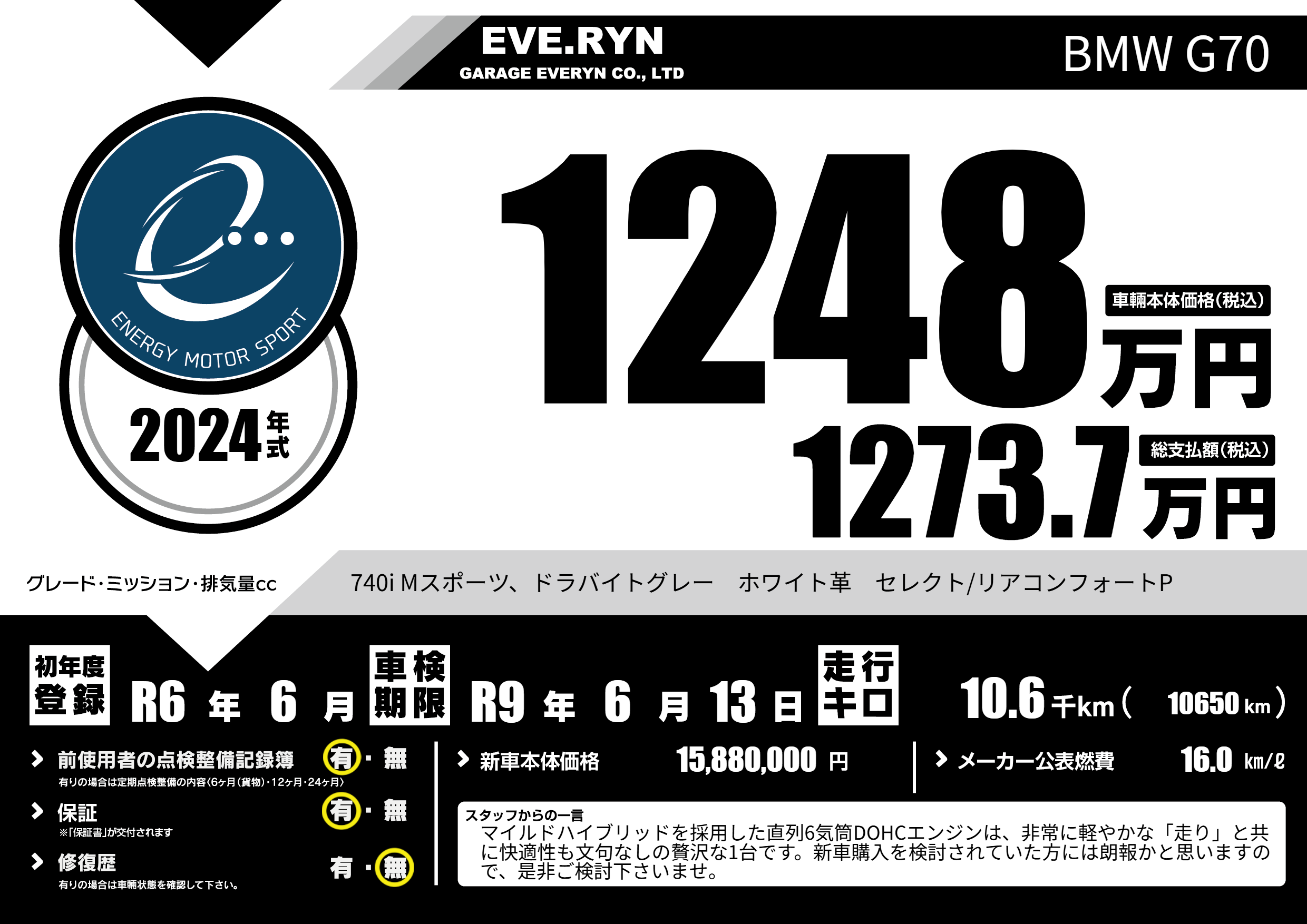 | 走行キロ | 1万km | 初年度登録 | R6年6月 |